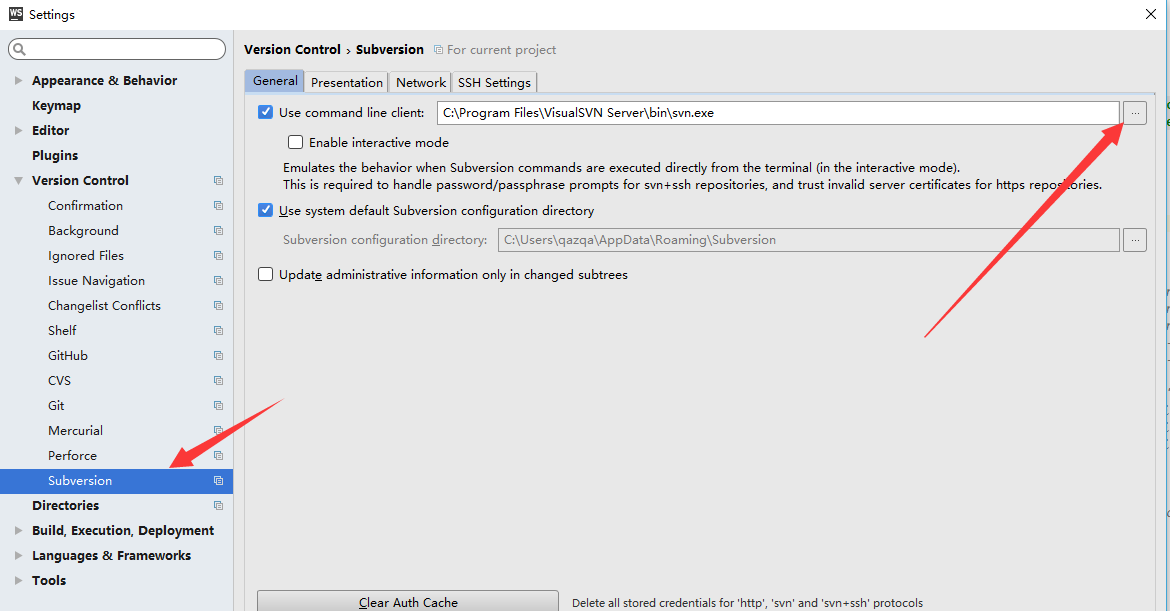 安装完成之后,打开webstorm,点击file—setting—version control—subversion,点击后面三个点的这个按钮,选择SVN的安装路径,再点击ok即可。之后webstorm会重启。