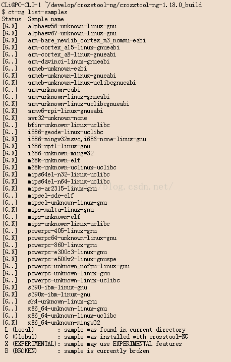 下面以编译crosstool-ng中:通过ct-ng list-samples中得到的输出为例,当做交叉编译器的名字的例子,供参考: