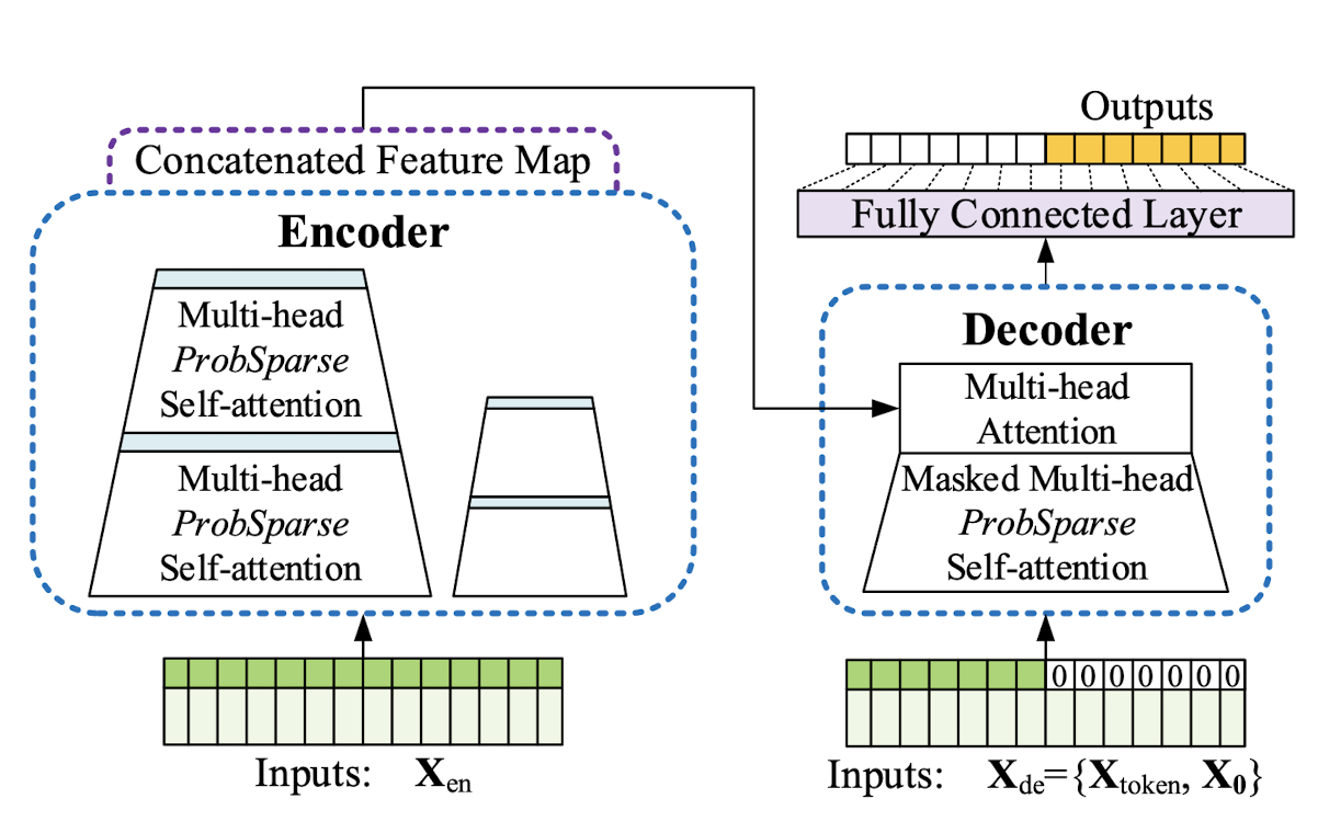 【paper-note9】Informer: Beyond Efficient Transformer for Long Sequence Time-Series Forecasting 前言Transformer[1]模型在NLP领域提出之后,风靡众多领域,有大一统的模式。这篇论文就是对 transformer 进行改进,提出 Informer 模型应用在长时序预测领域。该模型设计合理精巧,利用长尾分布截取头部的attention点积对,提高运行效率、降低运行成本;同时模型结合长时序预测的特点,在输出阶段采用生成式的方法,一次性生成待预测的序列,避免了传统序列预测方法中.