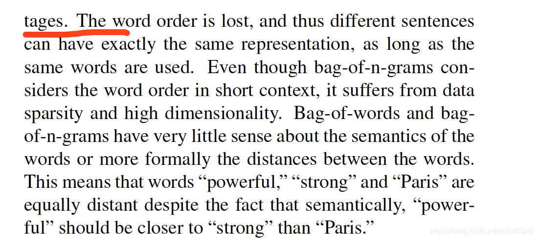 然而,单词包(Bow)有很多的缺点,词序丢失了. 因此,只要使用相同的单词,不同的句子可以有完全相同的表示.尽管n-g包在短上下文中支持语序. 但他也存在数据稀疏性和高维性的问题. bag-of-words 和 bag-of-n-grams对单词的语义或单词之间的距离几乎没有什么概念. 这意味着,尽管从语义上讲,“power-ful” 应该更接近“strong” ,而不是“Paris”,但“powerful” ,“strong”和 “Paris”这三个词的距离是一样远的.