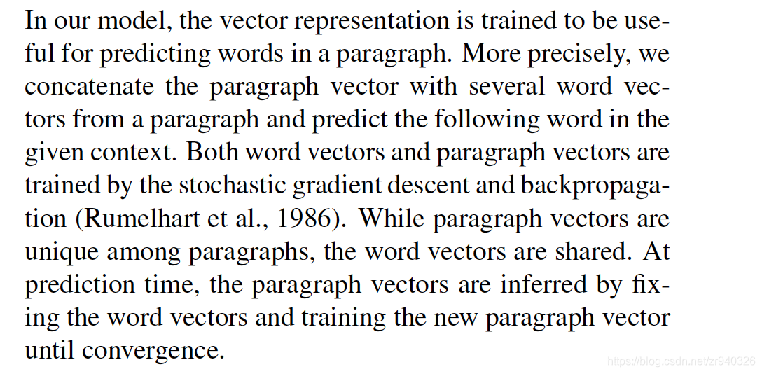 在我们的模型中,向量表示被训练成在预测段落中的单词时有用,更准确的说,我们将段落向量与段落中的几个单词乡里连接起来,并在给定的上下文中预测以下单词. 单词向量和段落向量都是通过随机梯度下降和反向传播来寻来的. 虽然段落向量在段落中是惟一的,但是单词向量是共享的. 在预测时,通过固定单词向量并选了新的段落向量来推断段落向量,直到收敛.