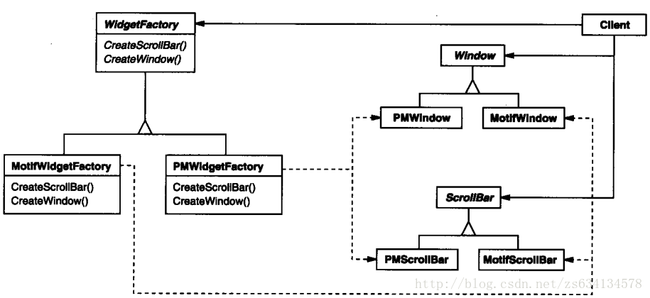 抽象类WidgetFactory类,这个类声明了一个用来创建每一类基本窗口组件的接口