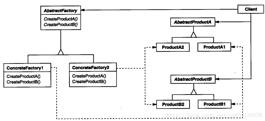 - AbstractFactory:声明一个创建抽象产品对象的操作接口