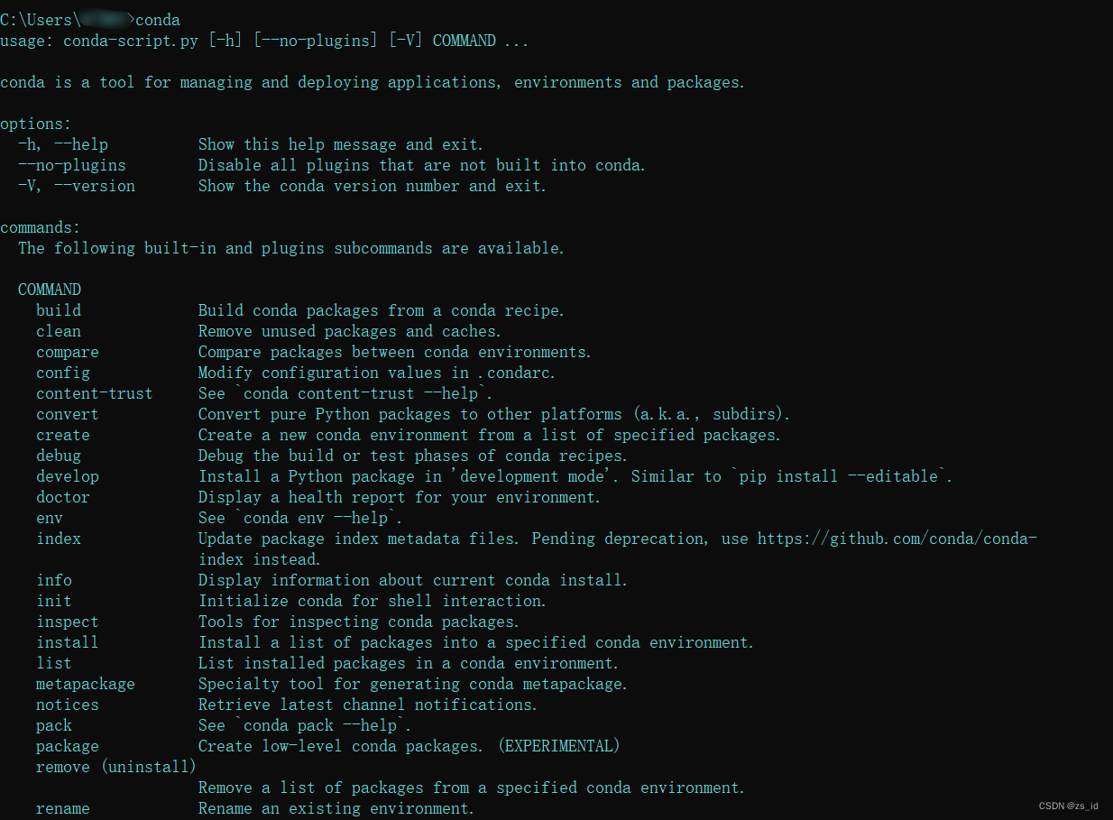 1、win+r调出cmd。输入conda,如果如图所示,则安装成功。