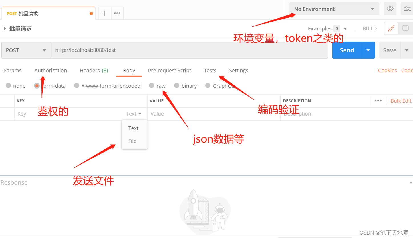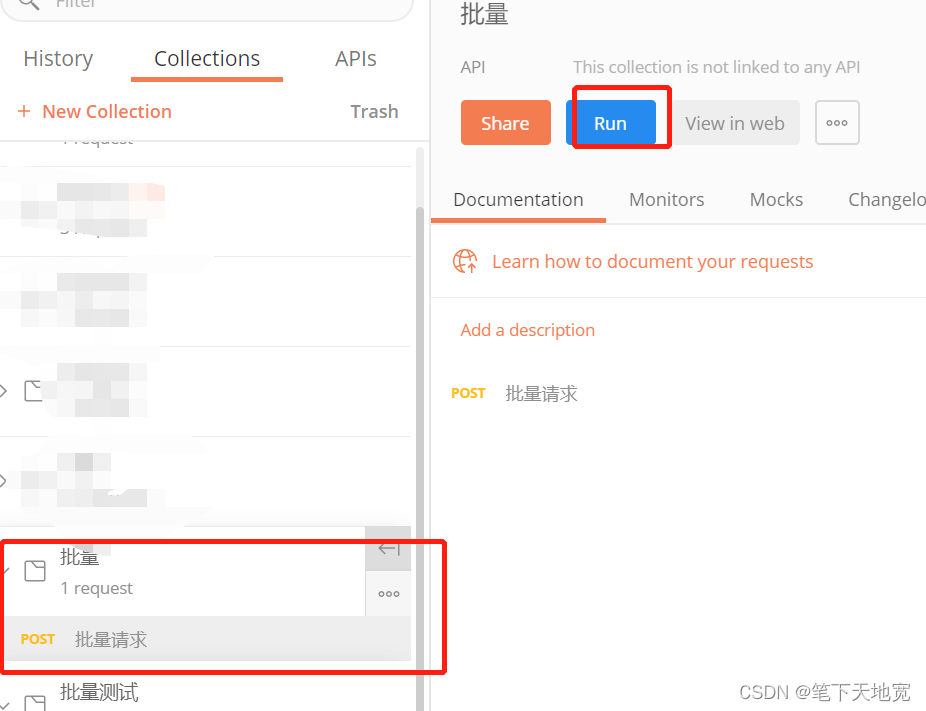 如图,然后把这个请求保存到一个collections,点击run,选择你的入参,就可以批量访问了。