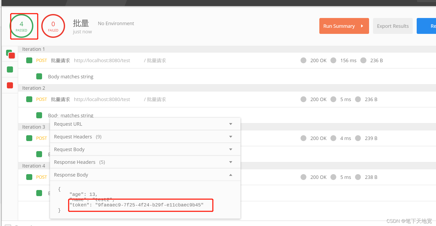 可以看到,4条返回都包含“name”,故而自然是成功了~还有就是,token,我明明没有在文件找给你设置,但是仍然传递到服务端了,这就是全局变量的作用了,随时用,随时取!当然平时token可能会失效,这个时候,就要重新获取下token,设置下全局变量,然后就可以继续用了。