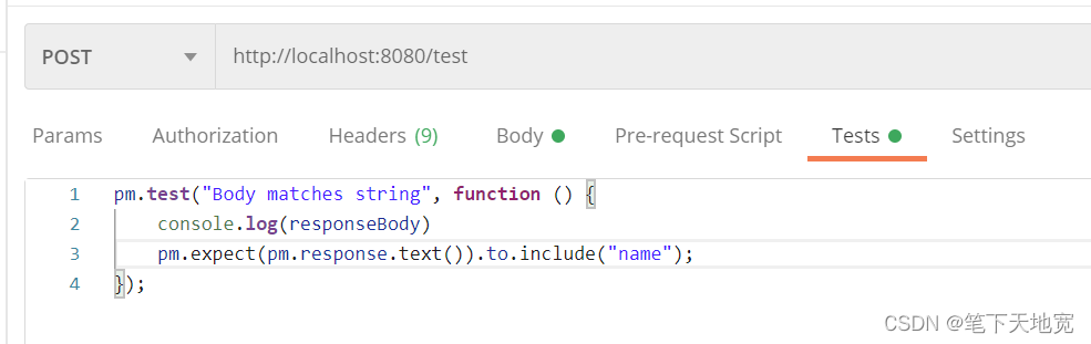 可以看到,我并没有设置token,下面设置下检测脚本,就是判断是否请求成功,比如接口返回成功标志200,或者是返回了你想要的数据等等。我这边写个简单的,看返回是否有“name”字符串。