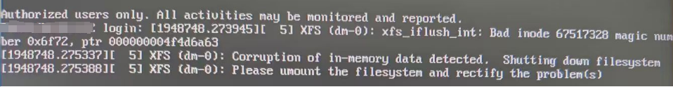 前段时间,客户一台kylinOS的虚拟机没响应了,登录控制台看到是这个画面,表示元数据(metadata) 损坏,xfs强行关闭了文件系统。