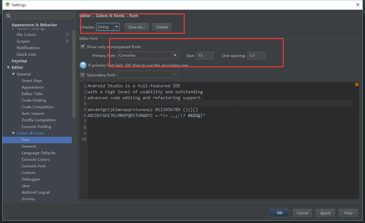 打开File-Setting,找到Editor-Colors&Fonts,可以改变字体大小,这里需要注意,默认风格的字体大小是无法改变的,可以先点击Save As,另存为Scheme,之后,就可以修改字体大小,和行间距了。