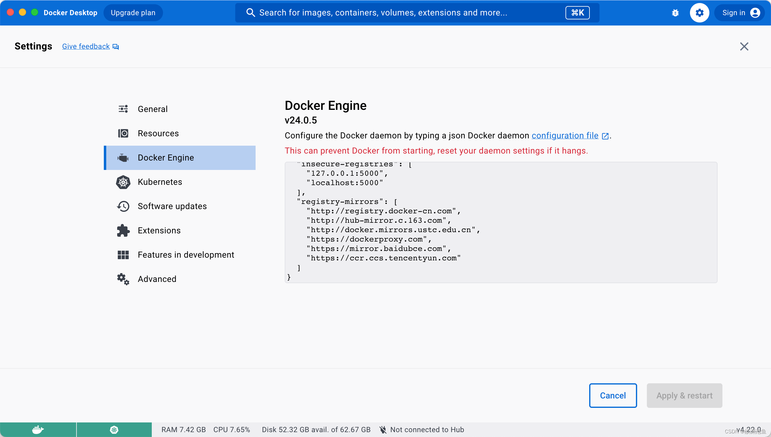 本机已经安装好docker desktop,未安装的自行参考其他教程。如果不能翻墙,可以修改本地的镜像地址,可在docker desktop 设置中的docker engine中修改,如下图: