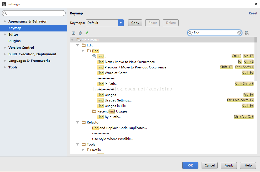 而在Default方式下给Find功能设置了两个快捷键 Ctrl+F 和 Alt+F3,对比以下两图: