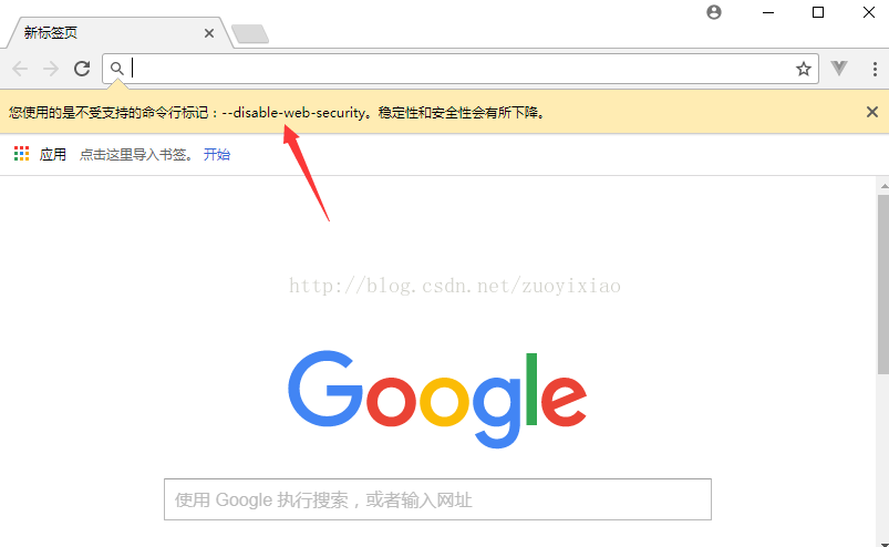 打开Chrome后看到如上右图所示的黄色提示栏即说明跨域配置成功,否则说明跨域无效。