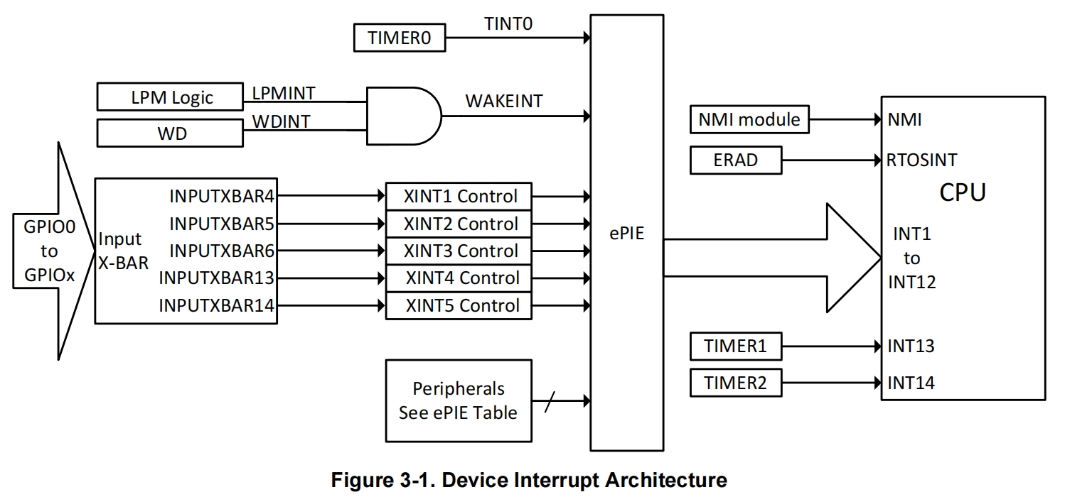 C28x CPU 有 14 条外设中断线。其中两条(INT13 和 INT14)分别直接连接到 CPU 定时器 1 和 2。其余 12 条通过增强型外设中断扩展模块(ePIE,或简称为 PIE)连接到外设中断信号。PIE 将最多 16 个外设中断复用到每条 CPU 中断线上,还扩展了向量表,使每个中断都能有一个 ISR。这允许 CPU 支持大量外设。