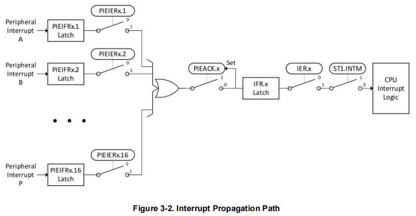 中断路径分为三个阶段 —— 外设、PIE 和 CPU。每个阶段都有使能和标志寄存器。该系统允许 CPU 在其他中断处于挂起状态时处理一个中断,在软件中实现和优先处理嵌套中断,并在某些关键任务期间禁用中断。