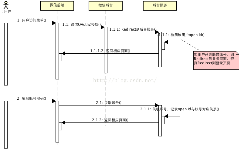 很多公司在做公众号营销之前,都已经有自己的一套用户体系,因此在公众号中,希望能接入自己的用户系统。其初衷可能是希望引入更多的新用户,也可能是想给用户提供更便捷的服务,或者其他,不管是哪一种,都需要将微信中的open id 与已有系统的账号进行关联绑定。提示绑定的地方可以放到菜单中,也可以放到自动回复中。下面是一个账号绑定的技术方案: