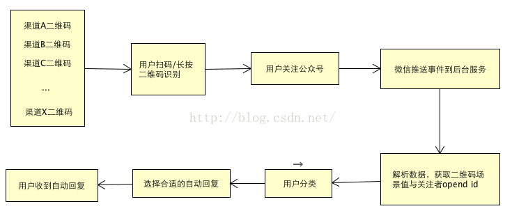 微信提供了生成带场景值二维码的功能,在用户关注后会把场景值推送到我们自己的服务器。基于这个我们可以生成不同渠道的二维码,并对关注用户进行合理分类,返回不同的自动回复内容,进行不同的引导。用户分类也是进一步生成个性化菜单和用户质量分析的关键。