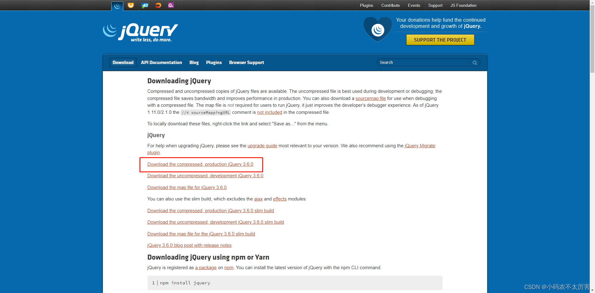 标记的是开发环境下的版本,按个人需要去使用版本,点开以后直接全选复制,在项目中创建一个js文件(例:JQuery.min.js),将代码ctrl-v在这个js文件中,在所需要的页面直接引入这个js文件就可以使用了。