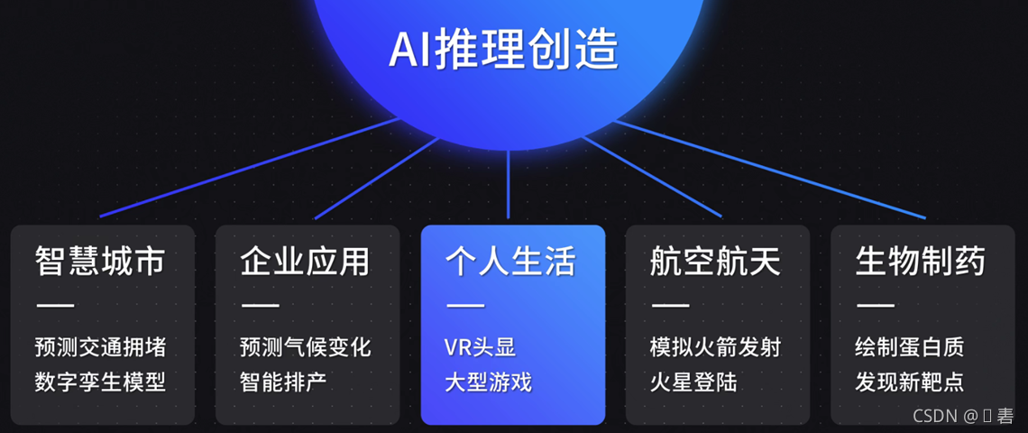 我们对这个领域其实不陌生了。元宇宙,它就是用AI创造驱动的新世界新空间,AI推理创造应该会在很多行业发挥很大的作用。比如在智慧城市领域预测交通拥堵,在智能建筑领域生成数字孪生模型,在光电风电企业预测气候变化在大型制造现场实现智能排产。在航空航天领域模拟火箭发射和火星登陆,在生物制药领域绘制蛋白质和发现靶点等等等等