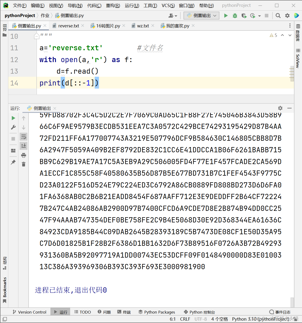 倒置输出得到一串16进制字符串,发现文件头是jpg,保存下来后