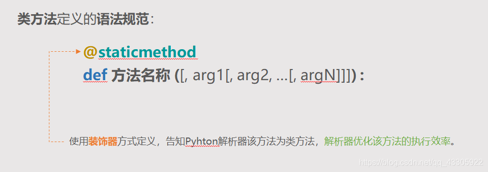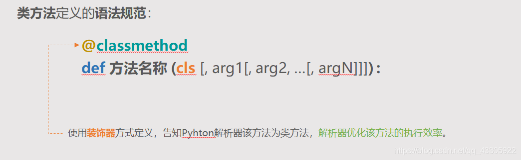 类方法定义的语法规范: def 方法名称 ([, arg1[, arg2, …[, argN]]]) :
