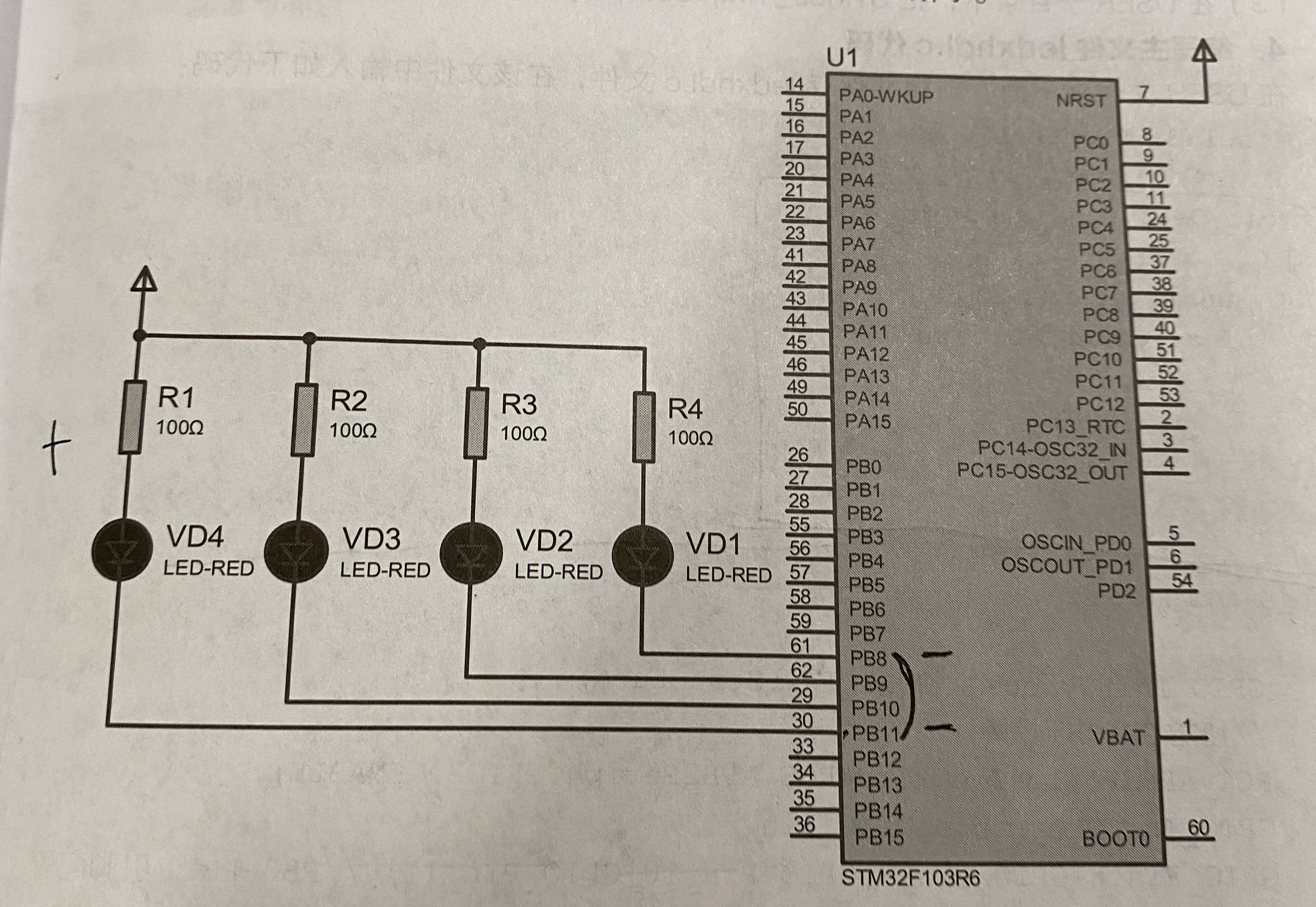 4个LED采用共阳极接法,其阴极接在STM32F103芯片的PB8,PB9,PB10和PB11引脚上如图所示下面是代码的实现,和数学一样实现一个目的代码可以有很多种编程方法,下面列举3个第一种方法#include "stm32f10x.h"unit16_t temp,i;void Delay(unsigned int count) //延时函数{ unsigned int i; for(;count!=0;count--) { .