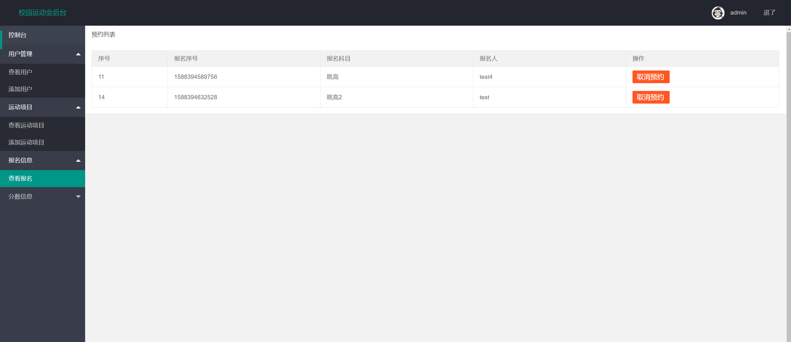 管理员登录后可以对个人信息进行管理、用户信息、运动项目信息、报名信息、成绩信息管理等。