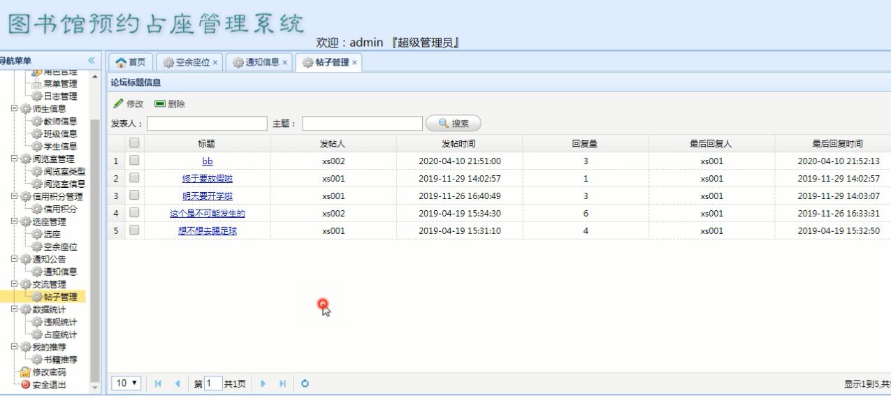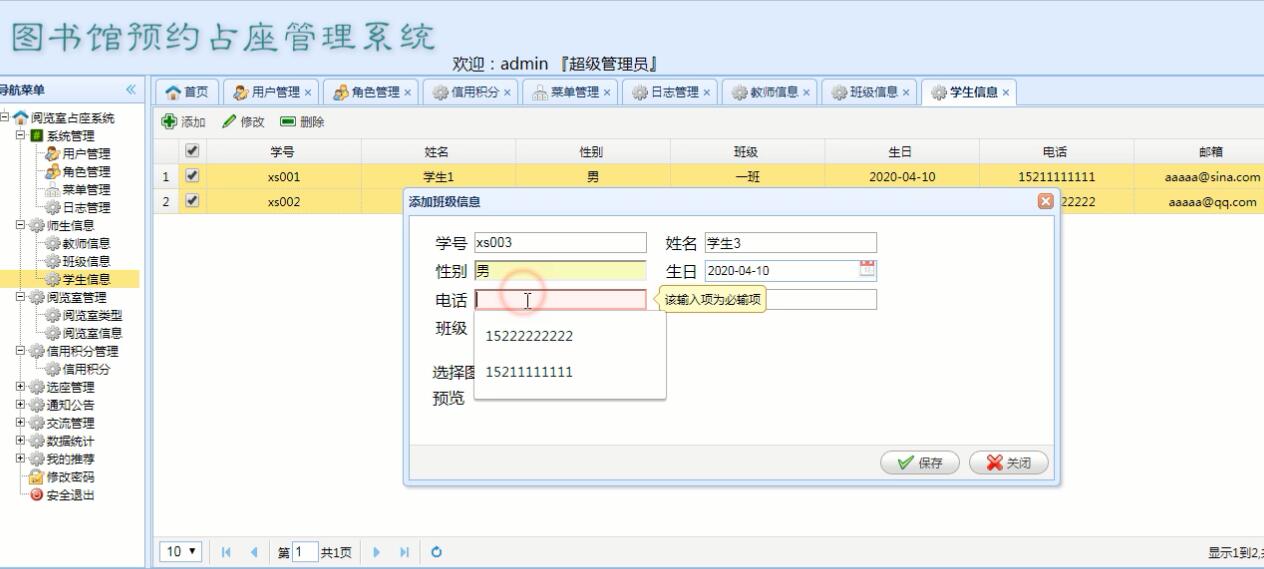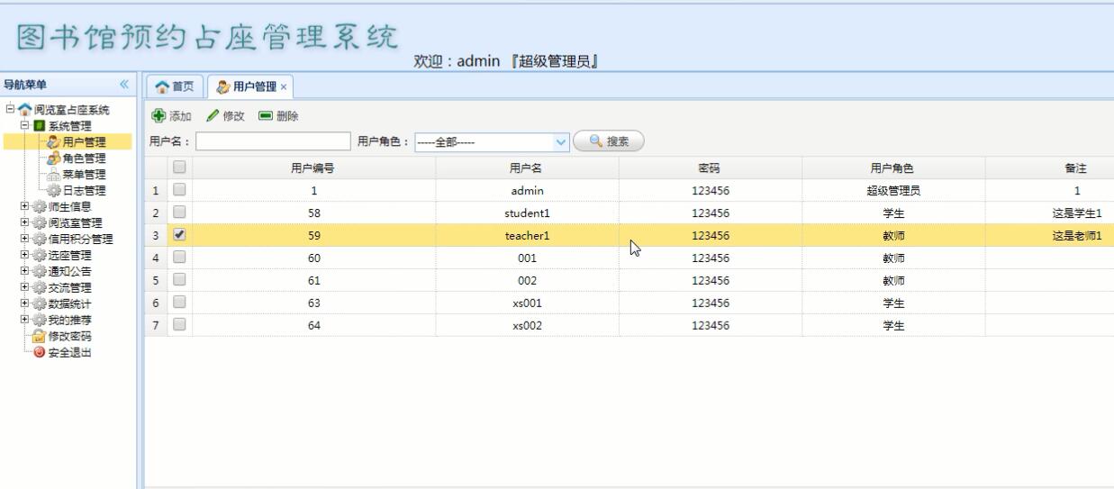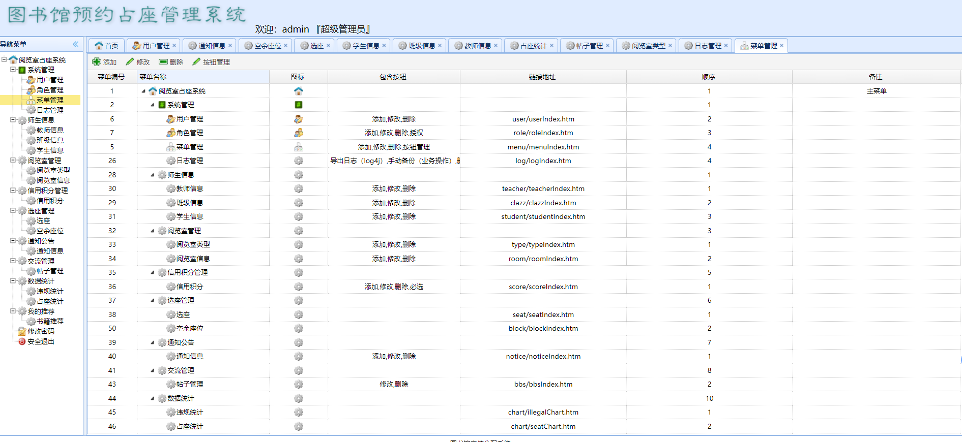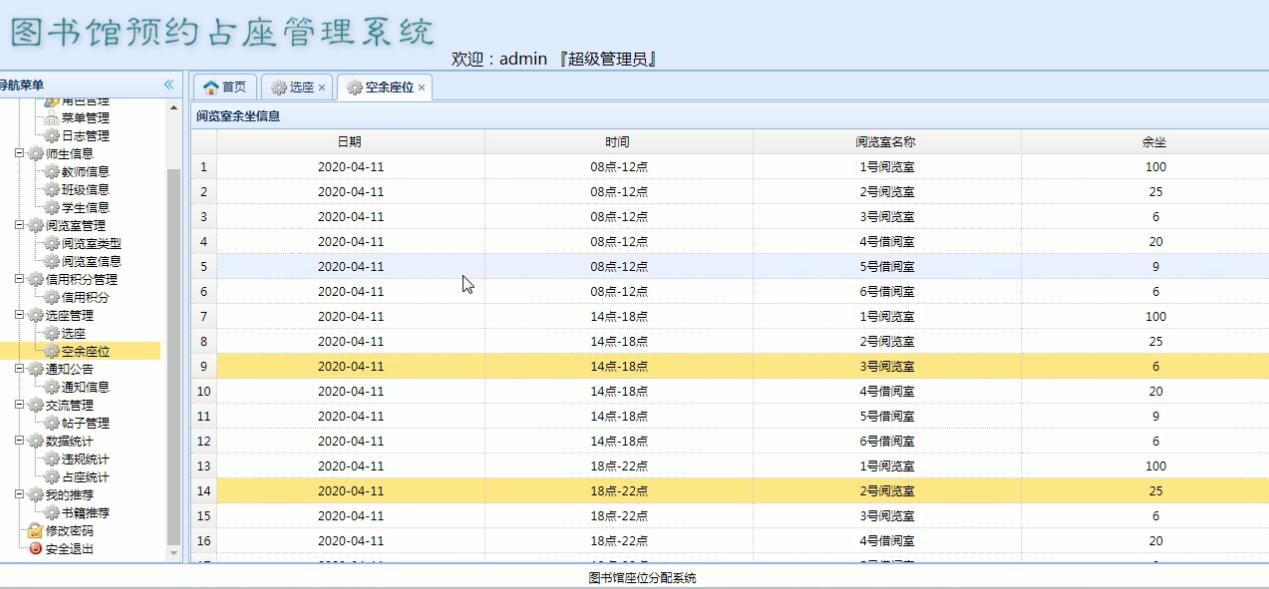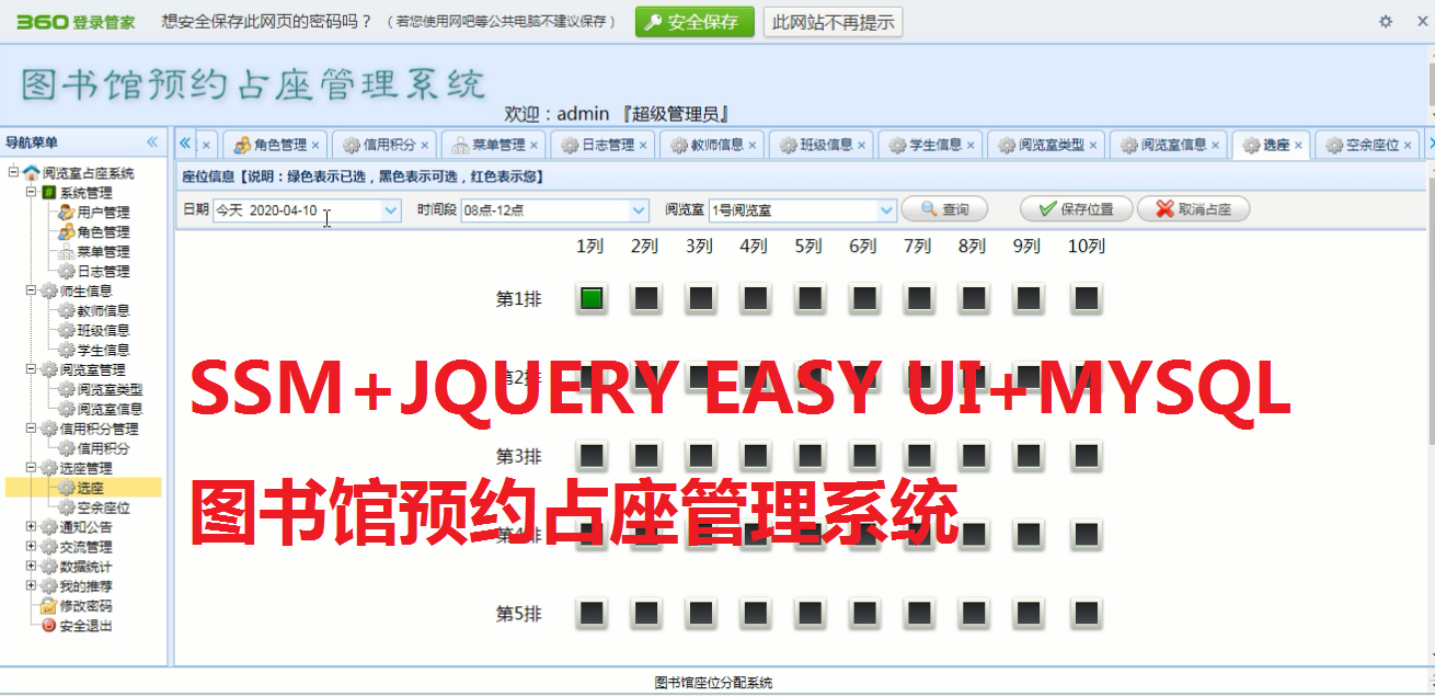 主要功能:学生端主要有学生信息、个人信息管理、预约座位,学生资料文件、查看图书信息、查看有否座位、等功能。 教师端,有教师信息,教师预约等.管理员端主要功能有管理员登录、首页,座位管理,座位统计,菜单管理、空座管理、学生信息管理、座位选择管理、修改密码、退出等功能。