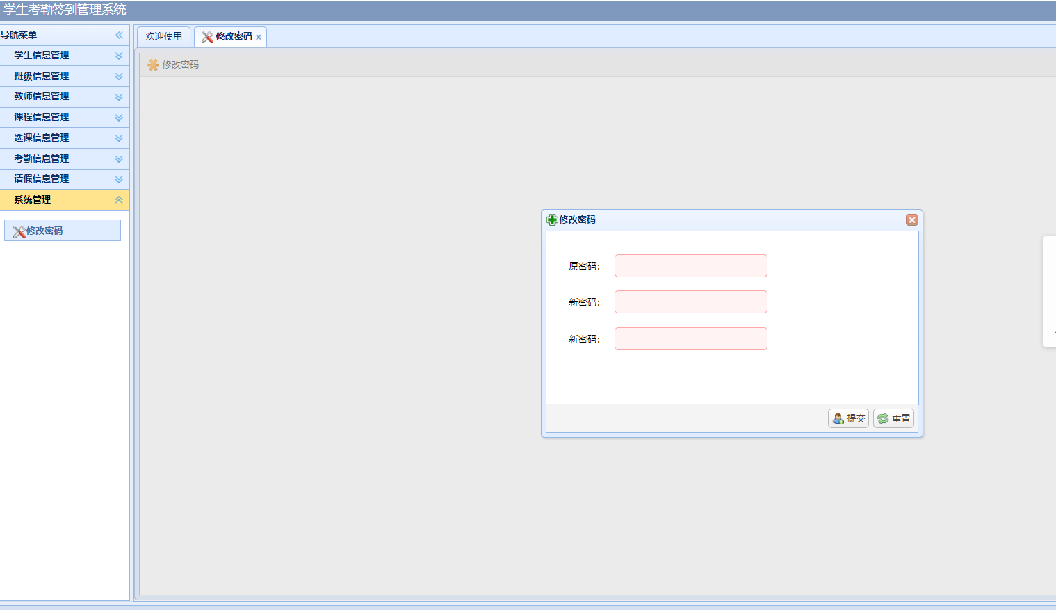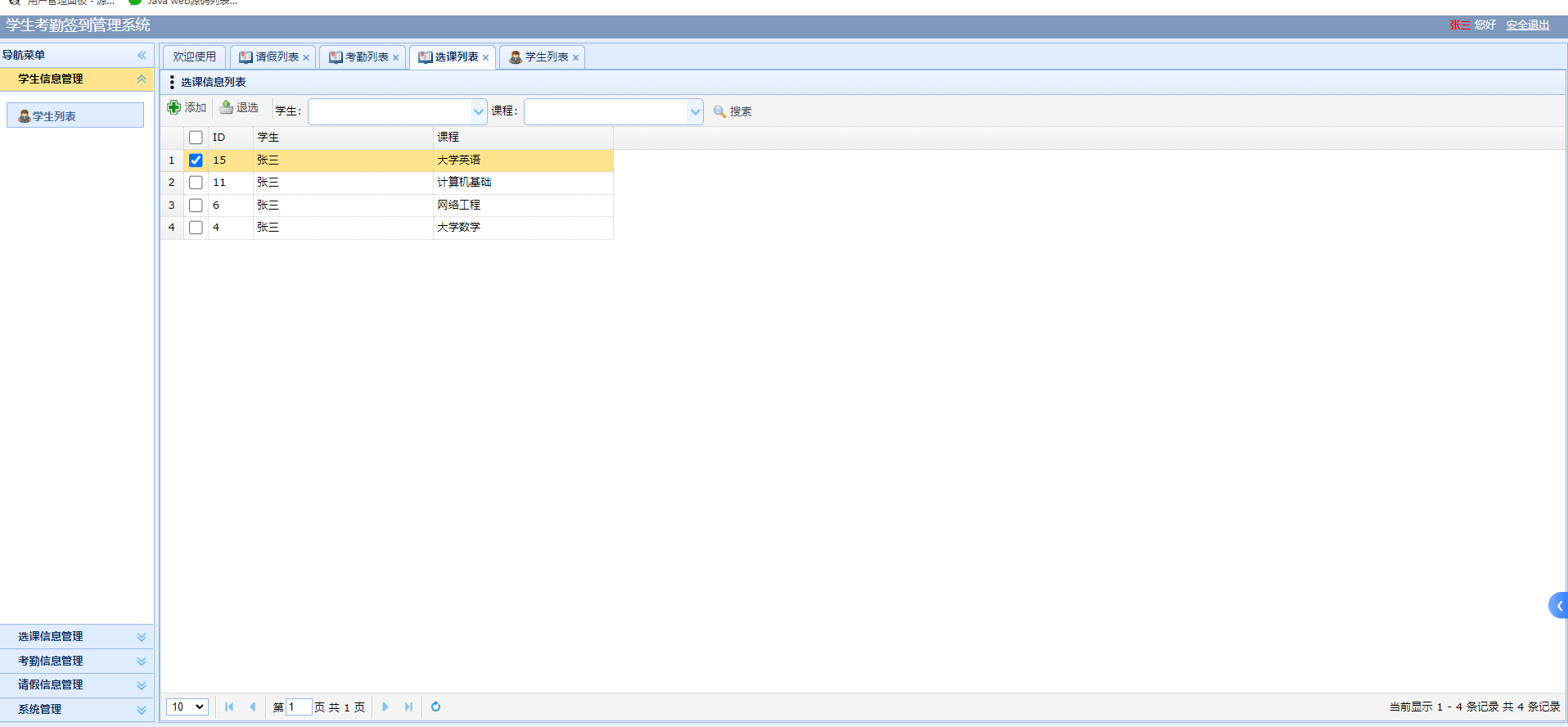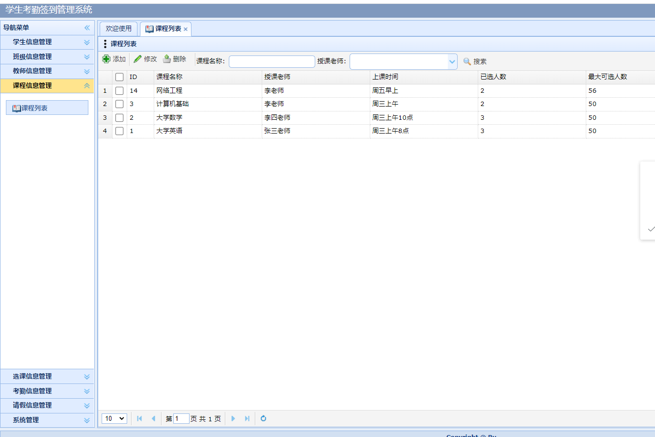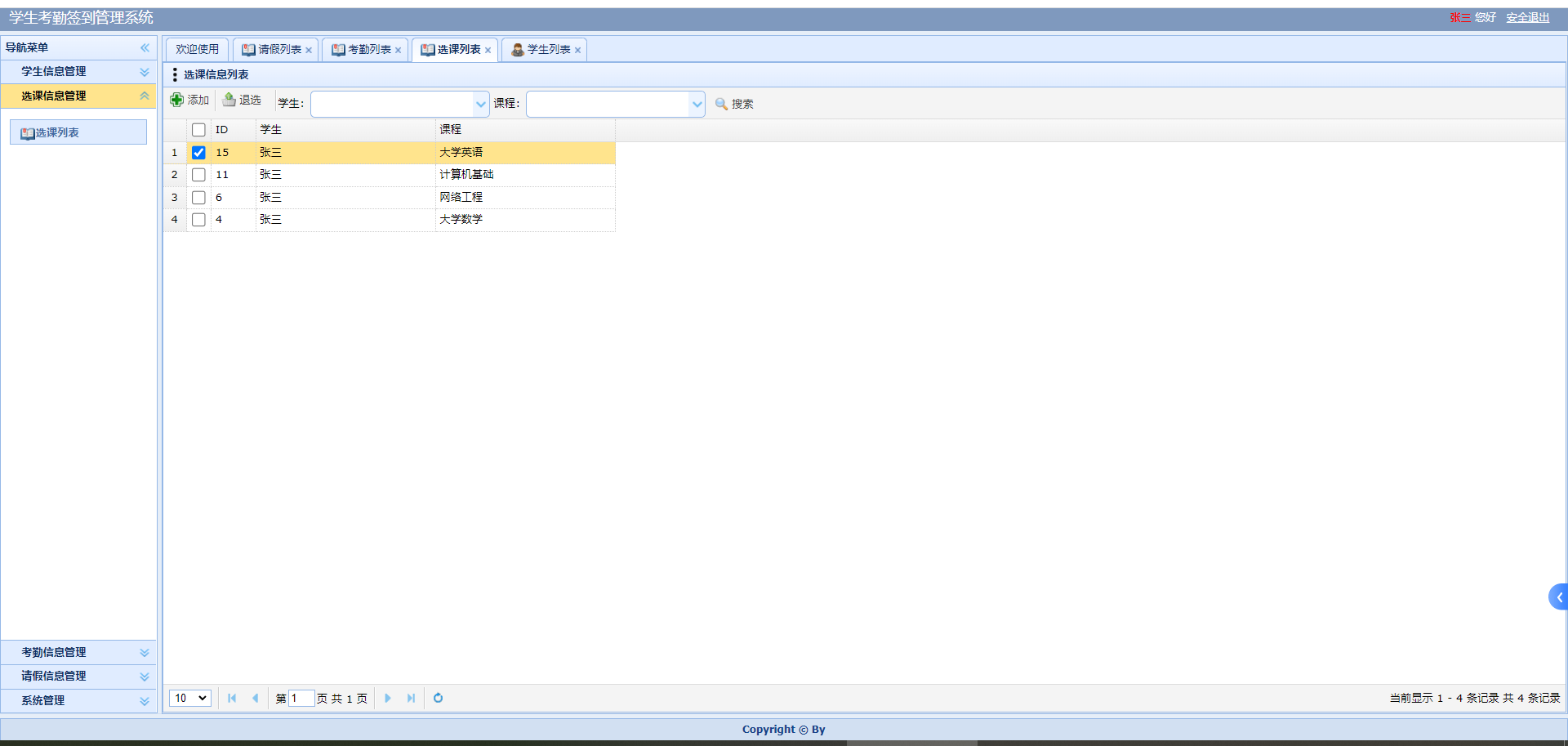 主要功能:学生端,主要有学生登录,班级信息管理、学生信息管理,课程信息管理,课程列表,选课信息管理,请假管理,请假列表,查看课程信息。 管理员端,主要功能有,管理员登录、首页,系统管理,老师信息,考勤列表,课程列表,课程信息管理、考勤管理、新闻管理、课程管理、修改密码、退出等功能。