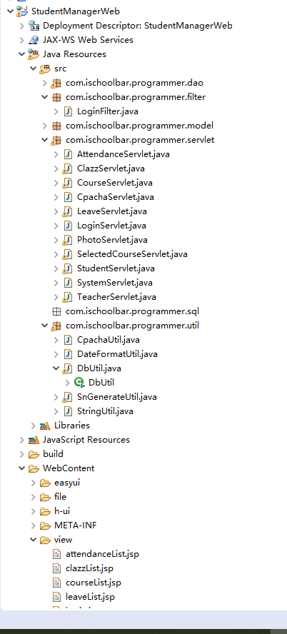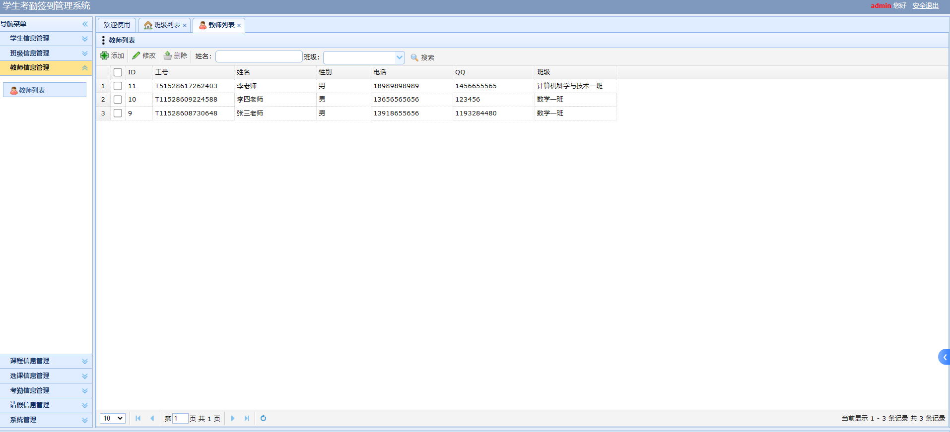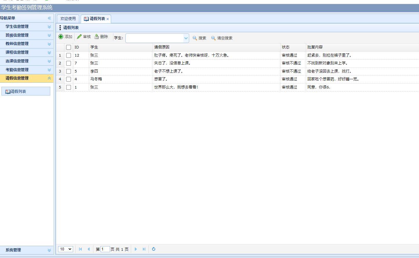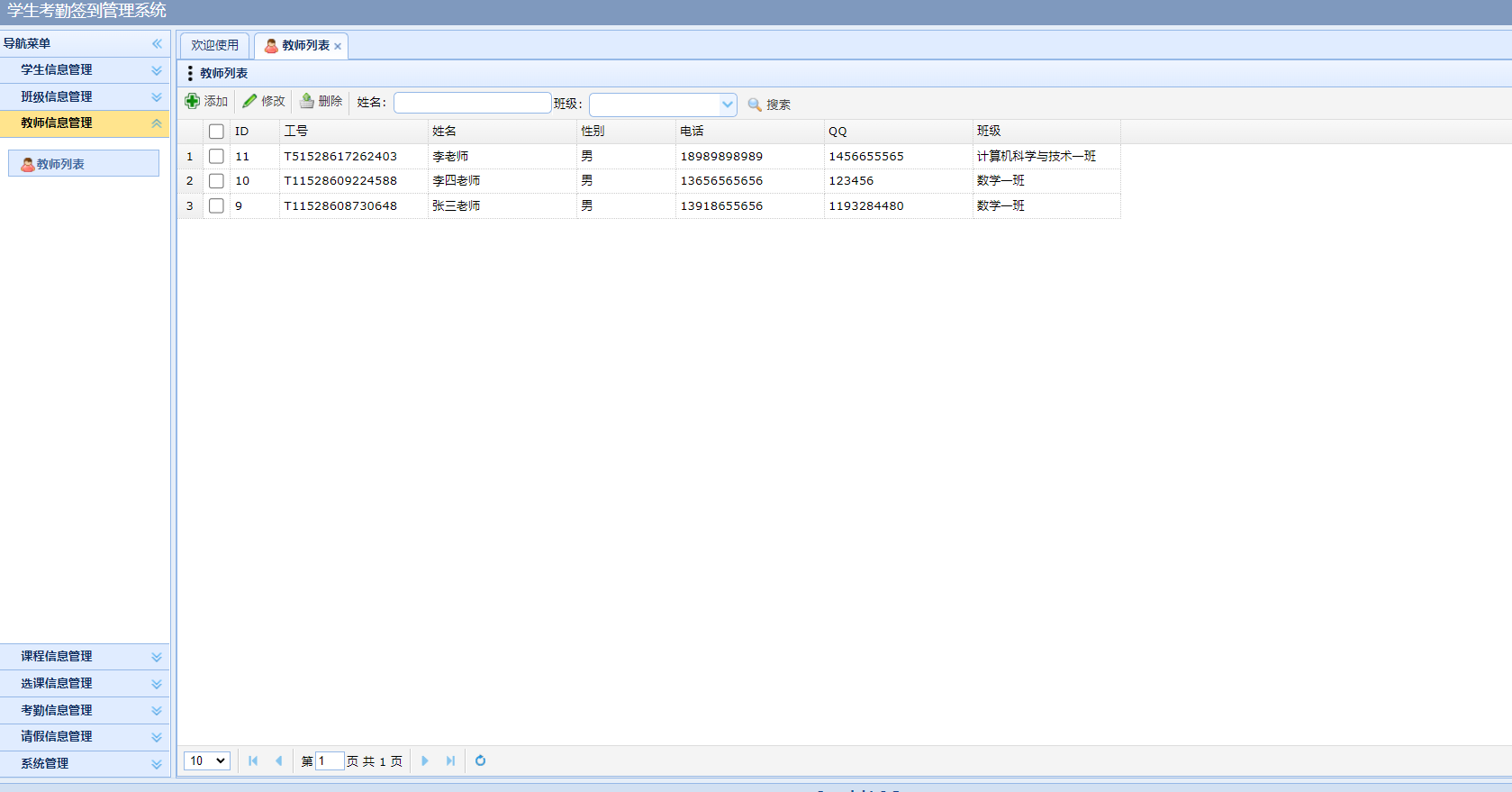 主要功能:学生端,主要有学生登录,班级信息管理、学生信息管理,课程信息管理,课程列表,选课信息管理,请假管理,请假列表,查看课程信息。 管理员端,主要功能有,管理员登录、首页,系统管理,老师信息,考勤列表,课程列表,课程信息管理、考勤管理、新闻管理、课程管理、修改密码、退出等功能。