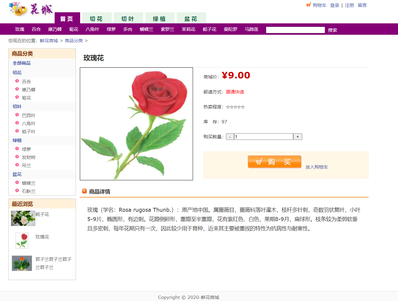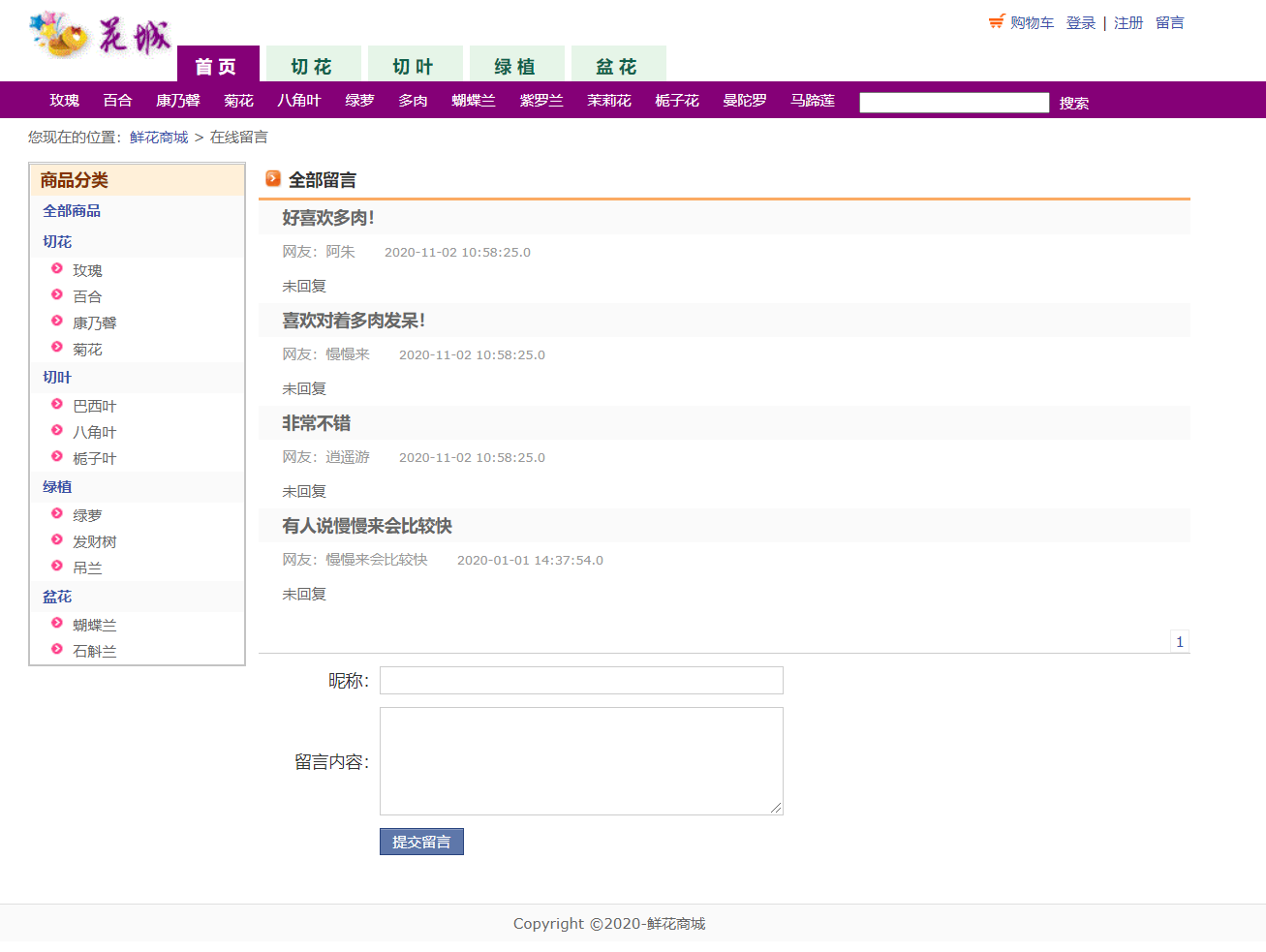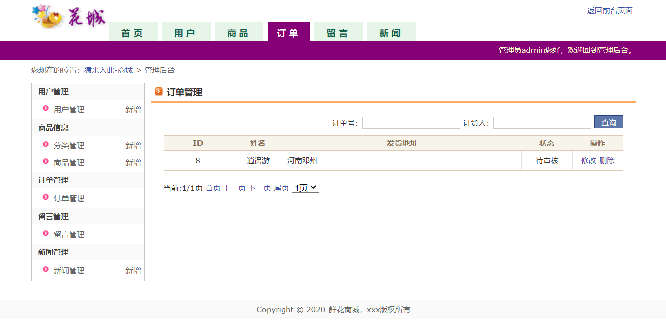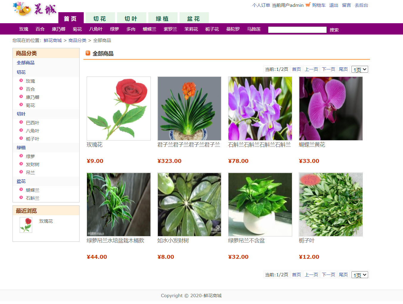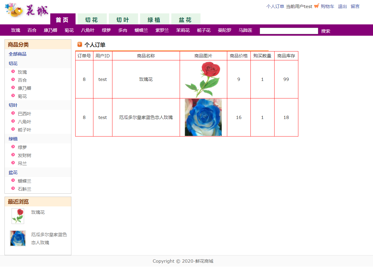 项目简介;本系统主要是网上鲜花商城,管理员管理用户下单购买鲜花的管理.主要功能;功能描述:网上花店(鲜花商城)分为网站和后台,用户注册登陆以后可以浏览鲜花购买鲜花,添加到购物车,也可以浏览花店新闻,留言等功能,管理员登陆以后,可以对用户管理、鲜花分类管理、商品管理、订单管理、留言管理及回复等功能。