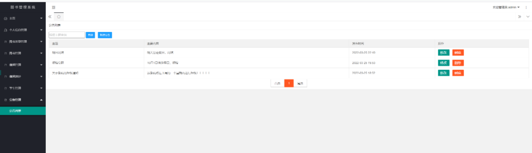 管理员主要有登录、个人信息管理、图书类型管理、图书管理、借阅管理、公告管理、借阅统计、学生管理等功能模块。