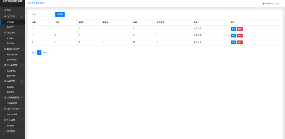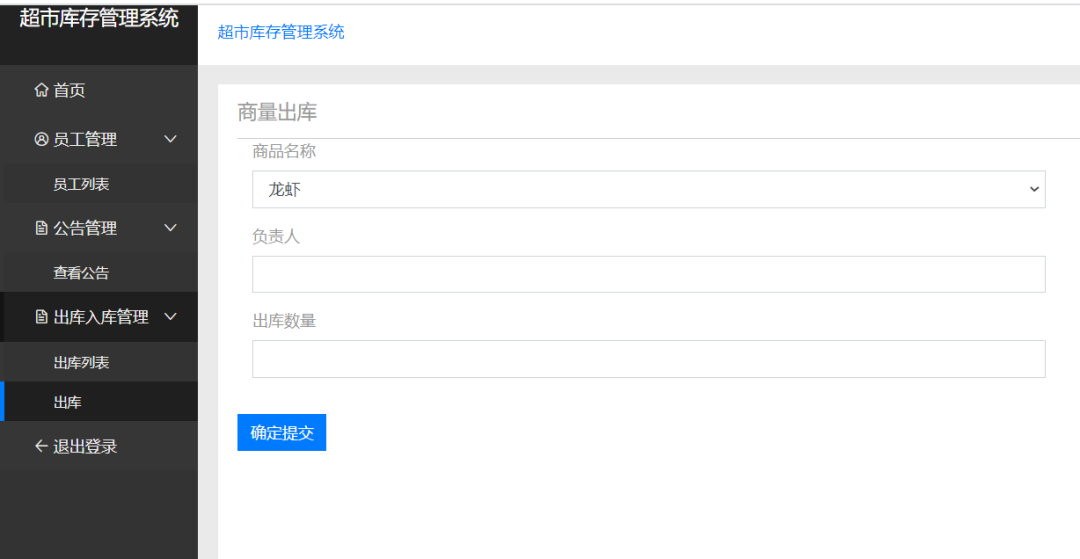 出库员工:登录、个人信息查看修改、出库管理(在商品列表进行出库操作)、查看公告