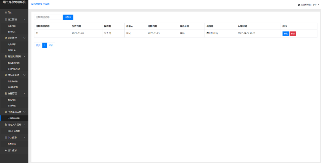 过期商品:查询、修改、删除已经过期商品(商品名、数量、生产日期、保质期、种类、供应商、入库日期)、查询接近保质期的商品(距离保质期15天)