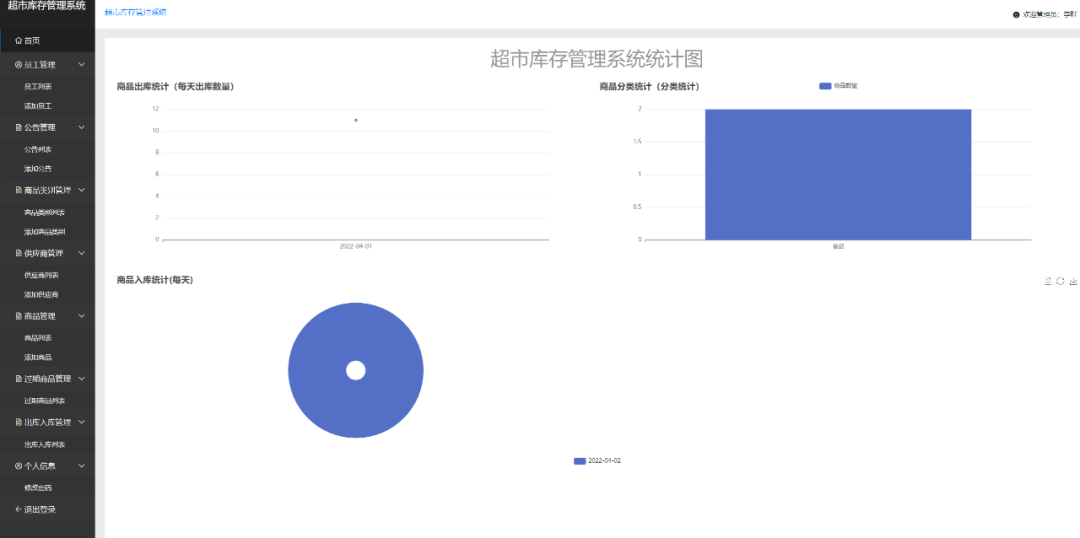 统计信息:商品信息统计(图表:商品种类表,即显示每种商品种类数量)、入库统计(图表化显示入库日期对应的商品种类、数量)、出库统计(图表化显示出库日期对应的商品种类、数量)