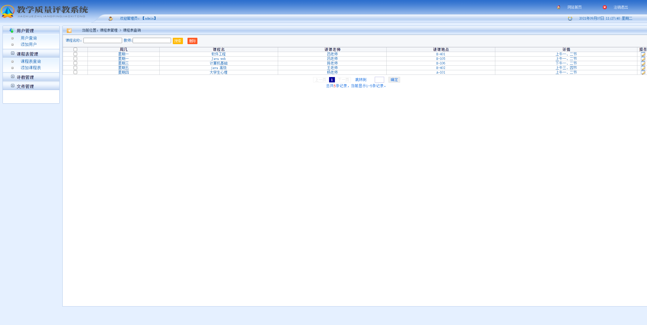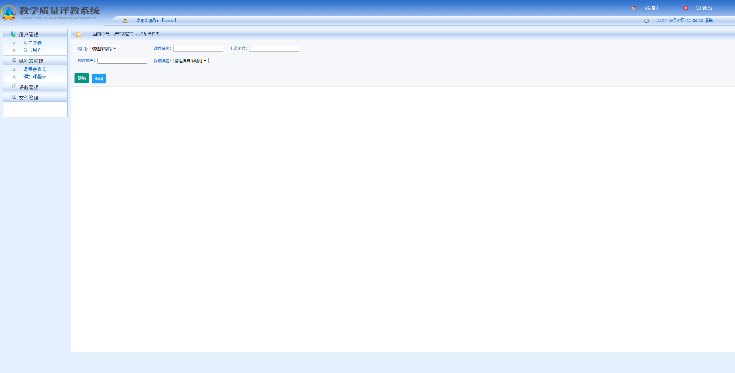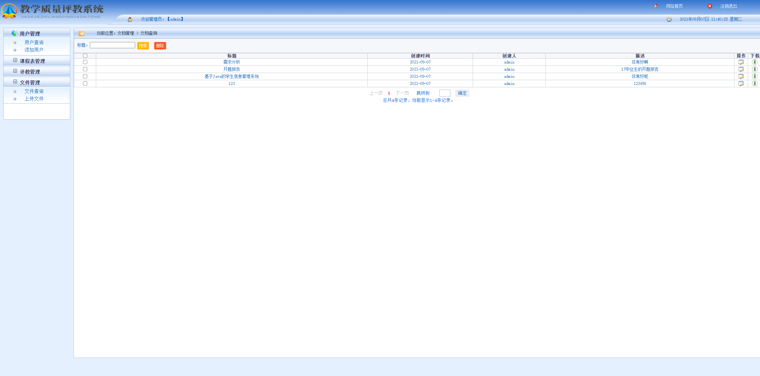 管理员端主要有登录、用户管理、课程表管理、评教管理、文件管理。