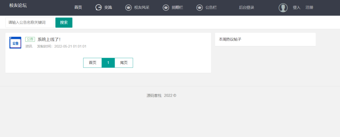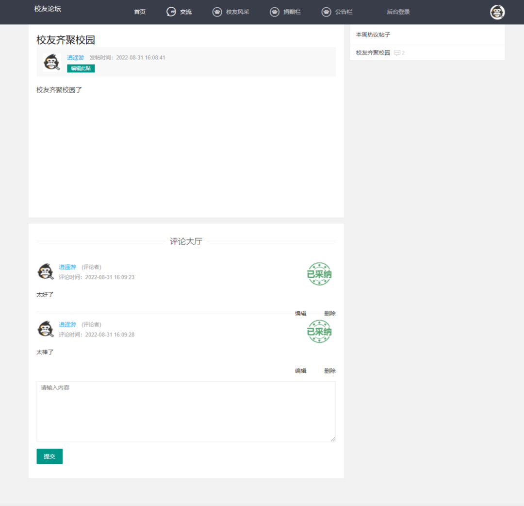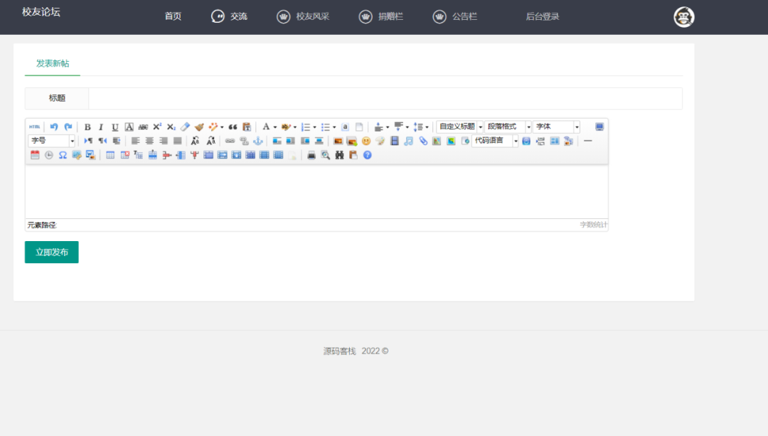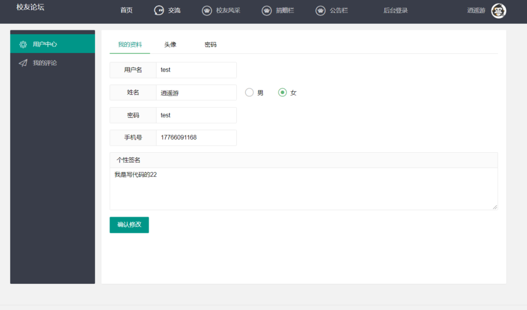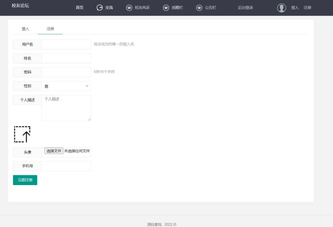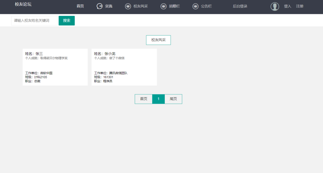 前台主要有登录、注册、发布帖子、评论帖子、修改头像、修改密码、查看公告、查看校友风采等内容。