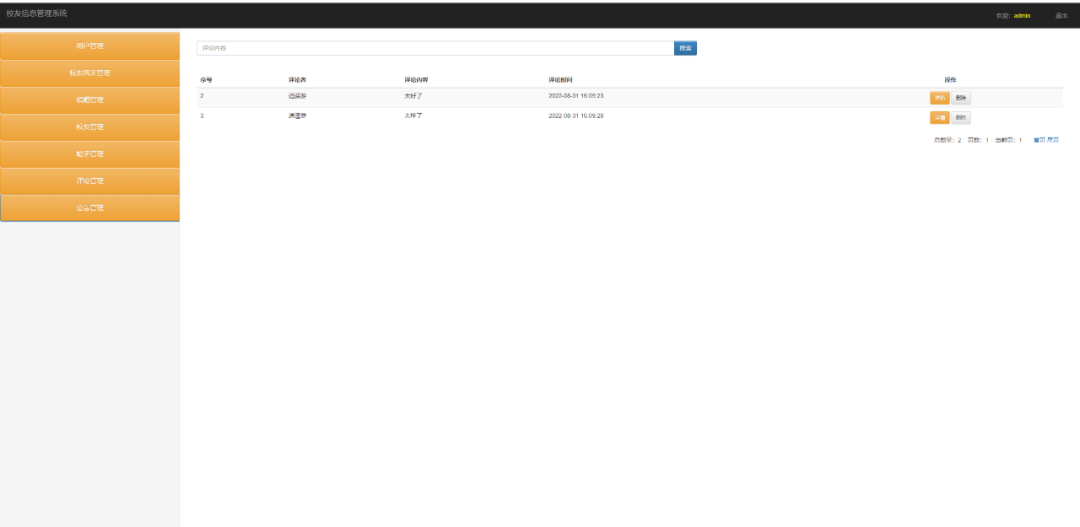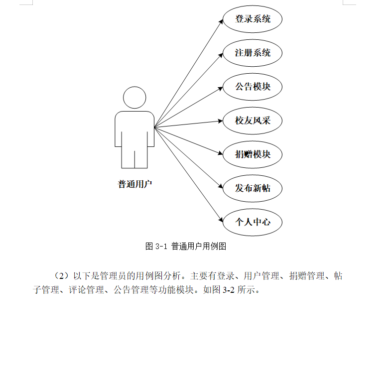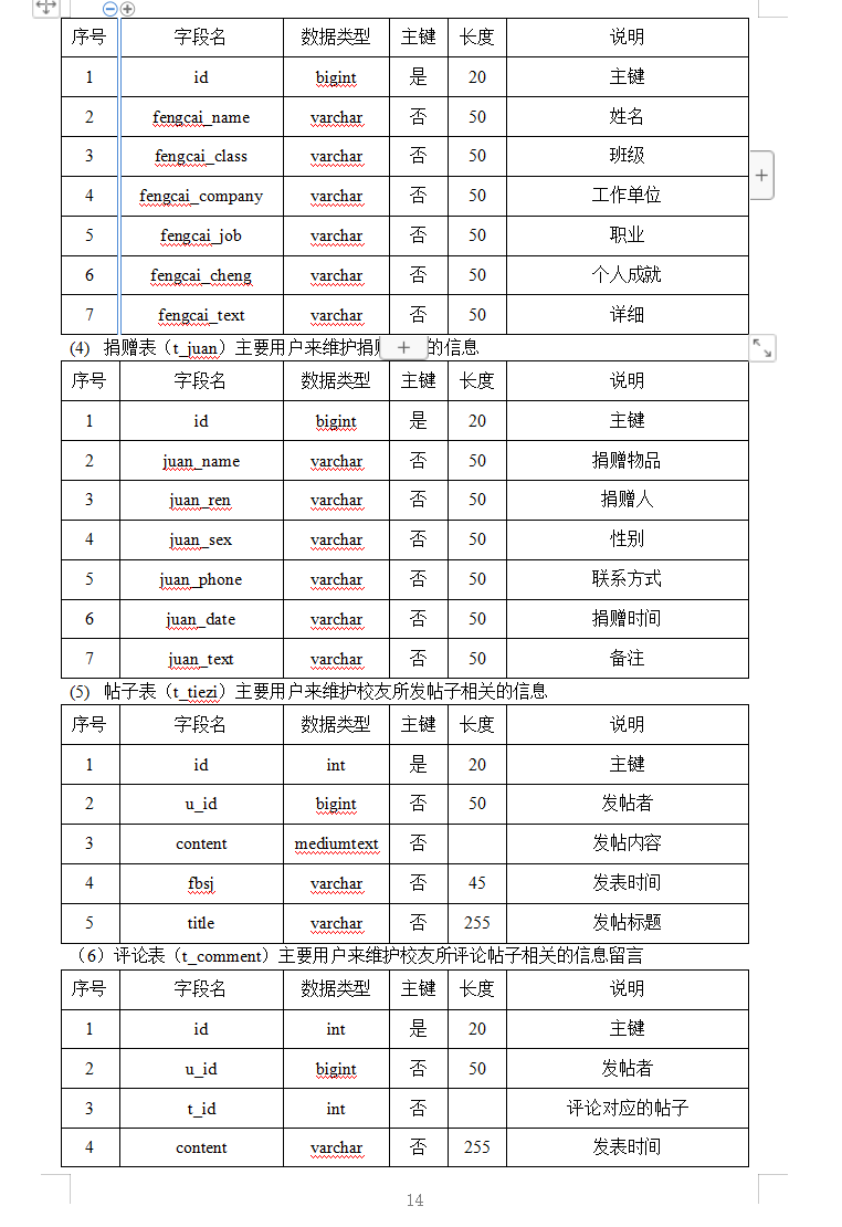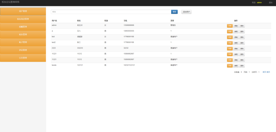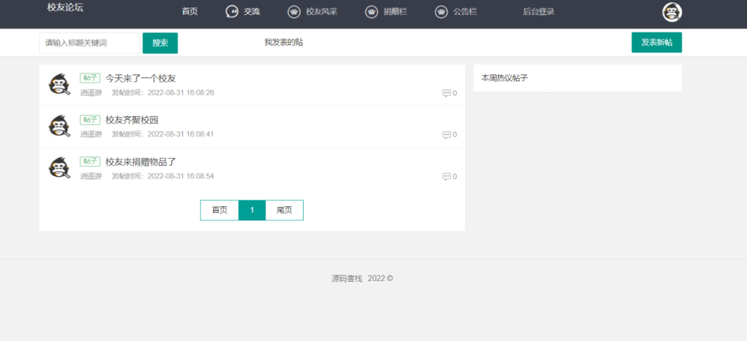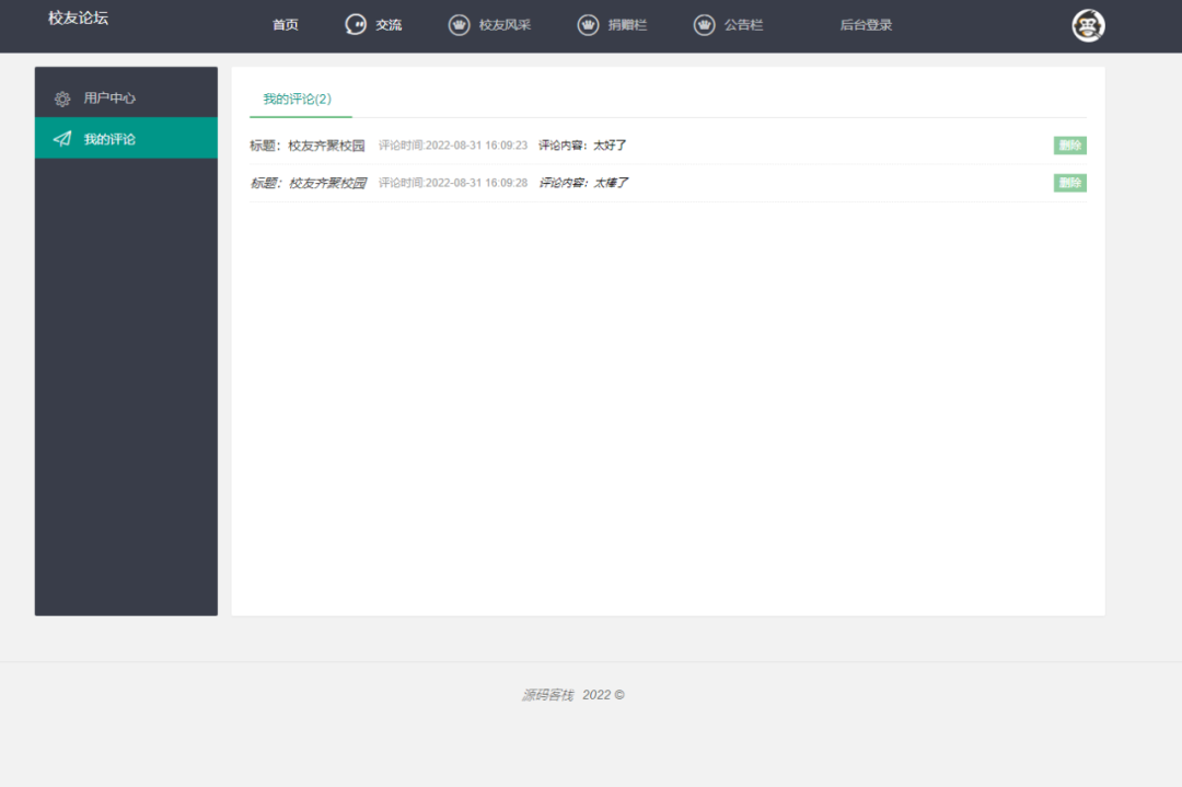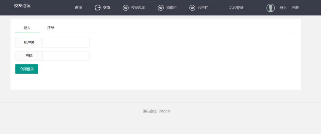 前台主要有登录、注册、发布帖子、评论帖子、修改头像、修改密码、查看公告、查看校友风采等内容。