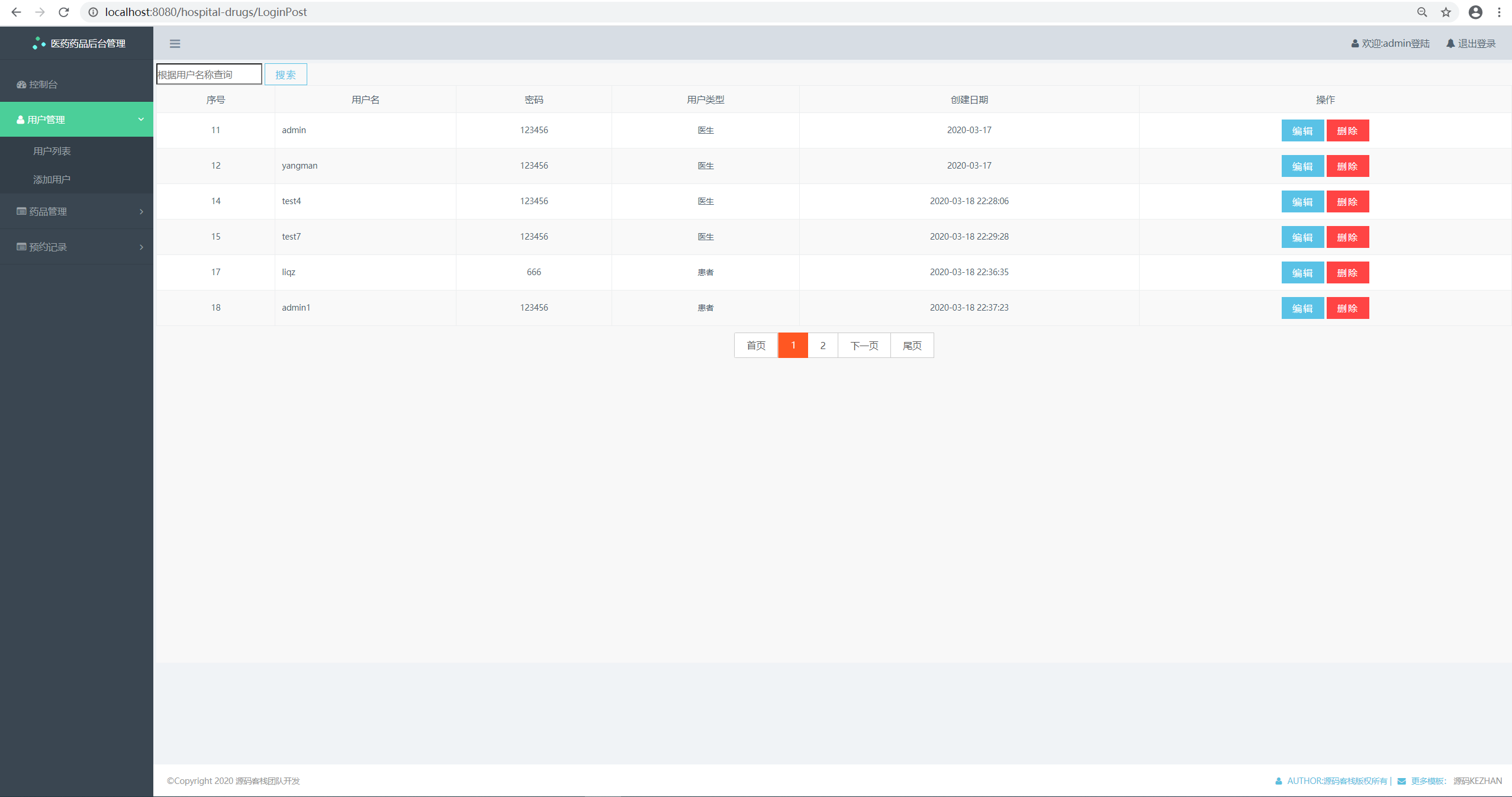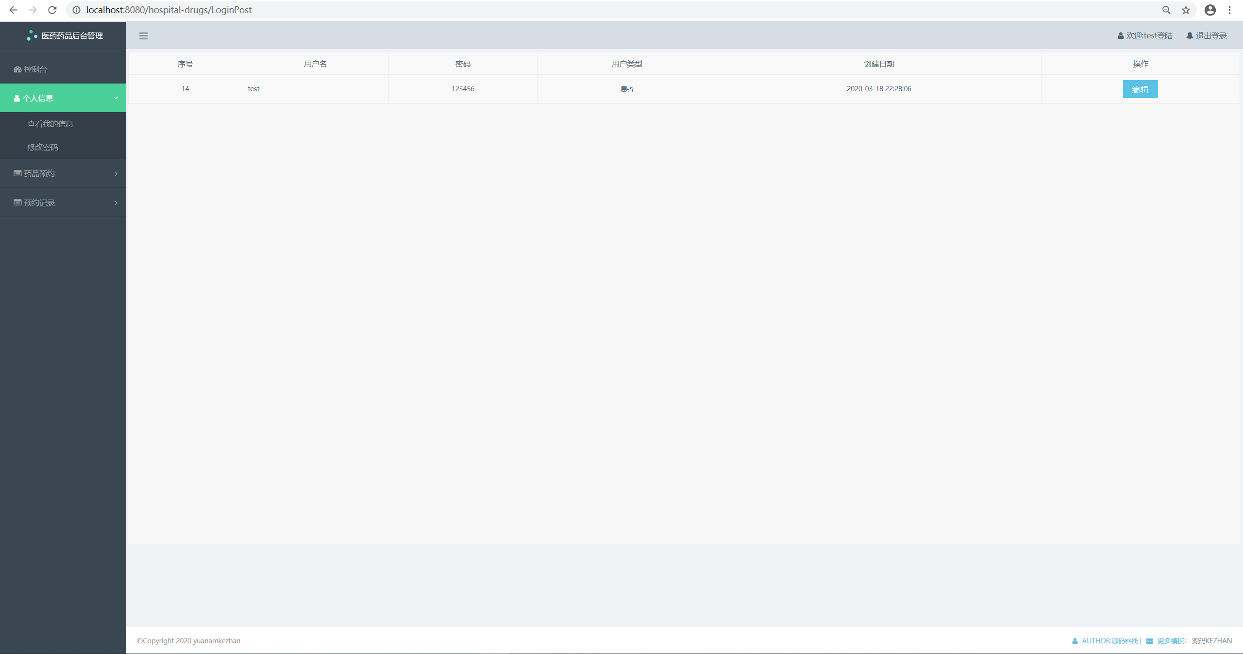 功能描述:本系统主要是患者可以注册、登录,然后查看个人信息,医药药品列表进行预约,管理员登录之后可以对用户管理、药品管理、预约记录管理的增删改查。
