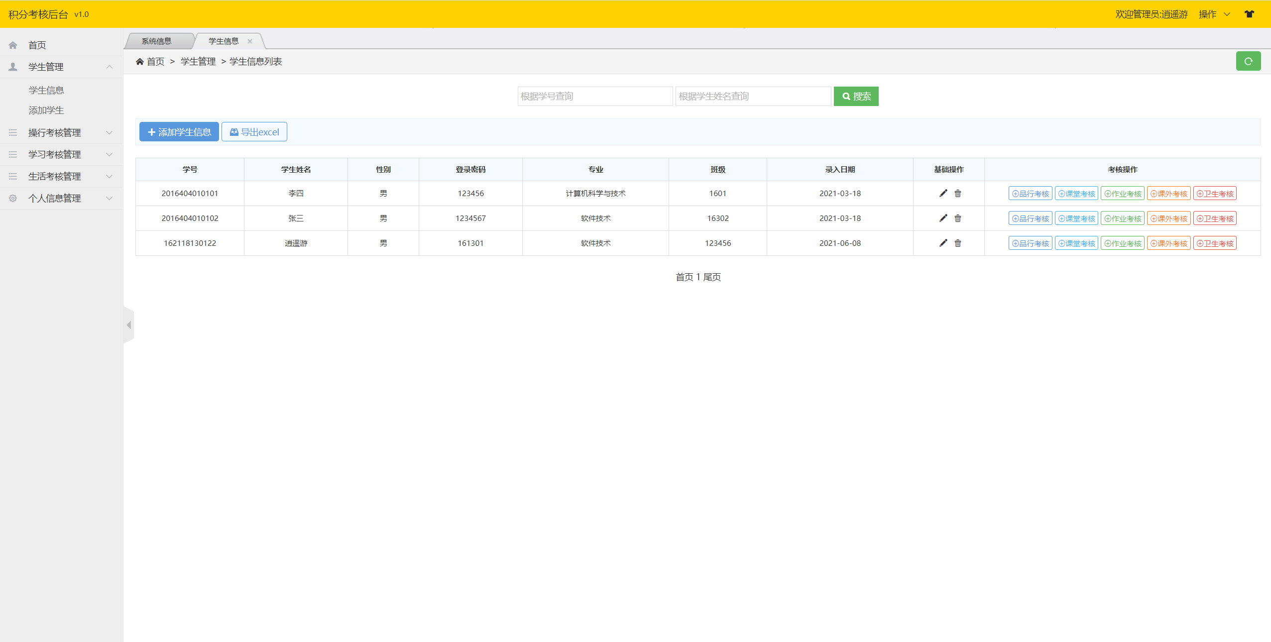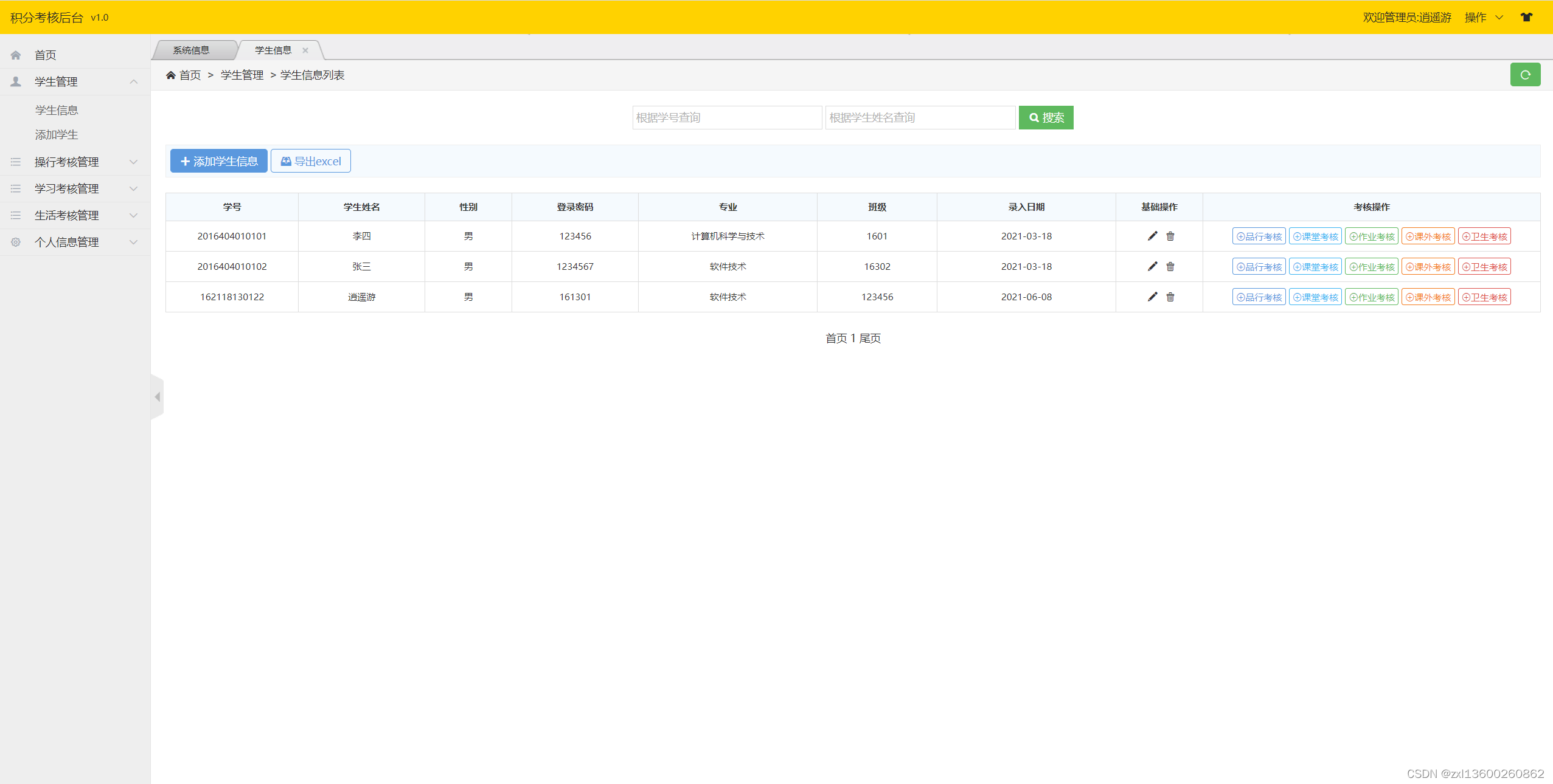 管理员端主要功能有登录、学生管理、操行考核管理、学习考核管理、生活考核管理、个人信息管理、退出等功能。