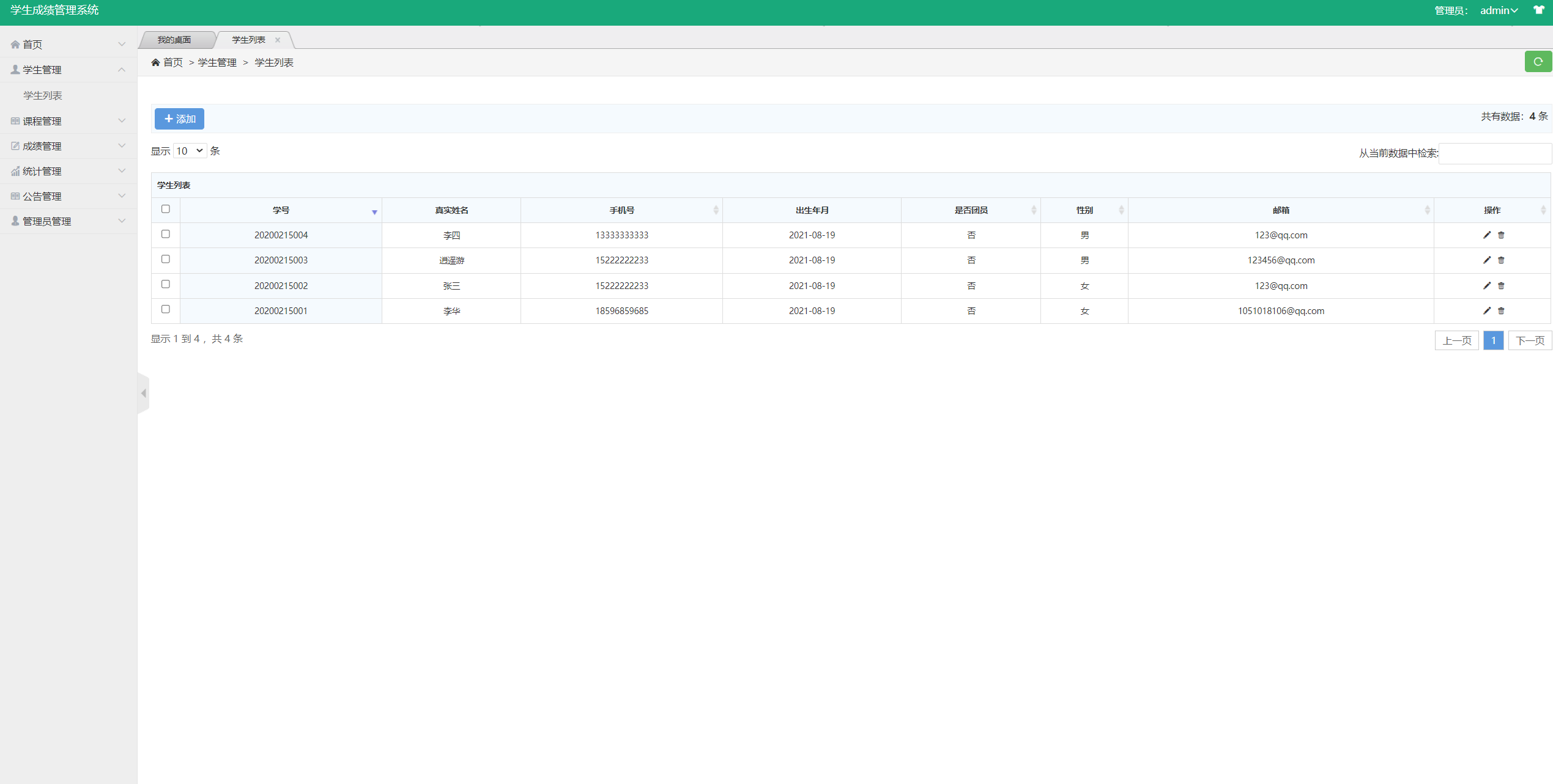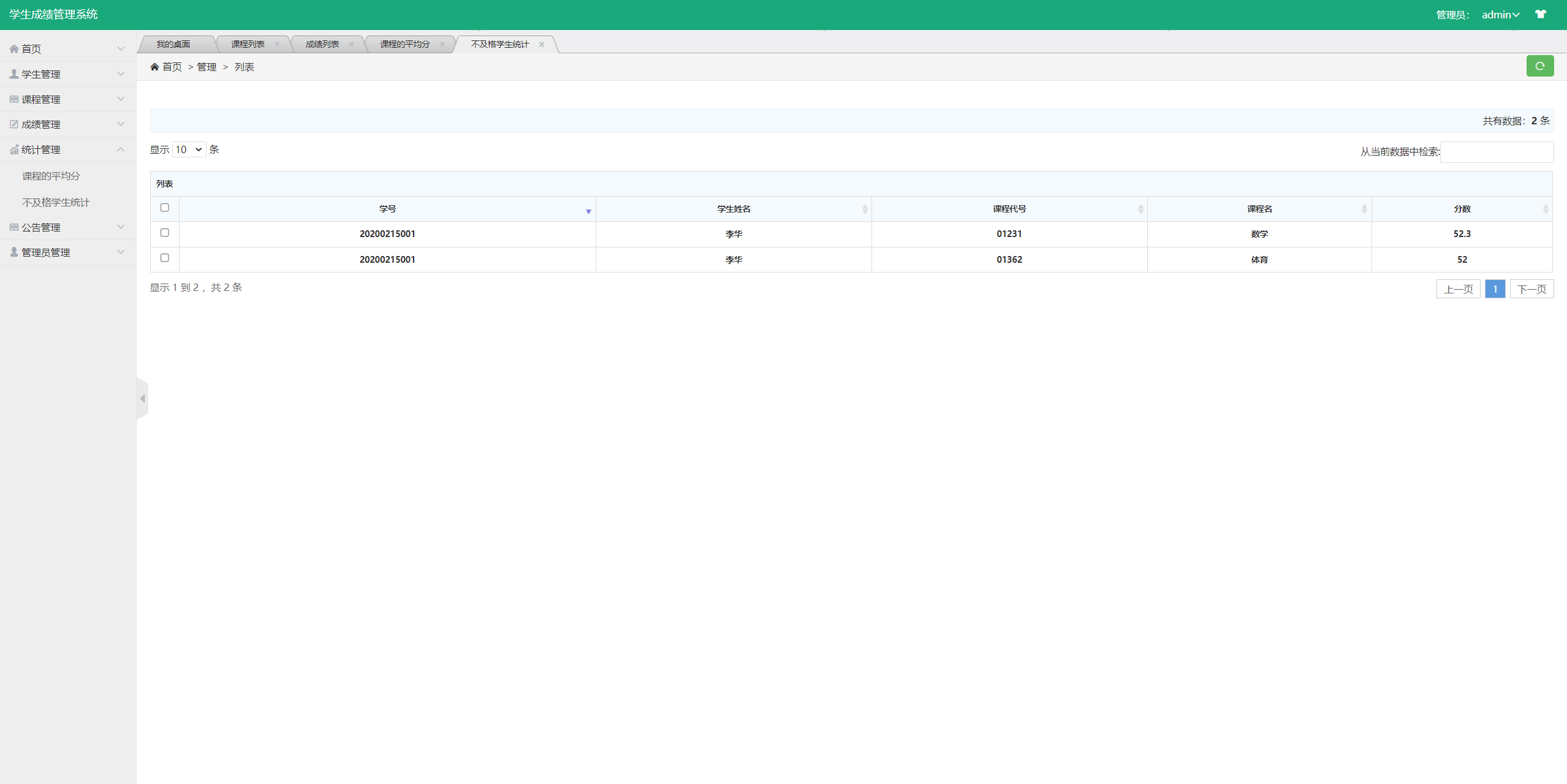 管理员登录后可以进行学生管理、课程管理、公告管理、成绩管理、成绩统计、管理员管理等功能。