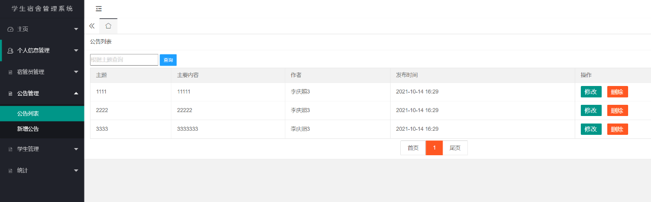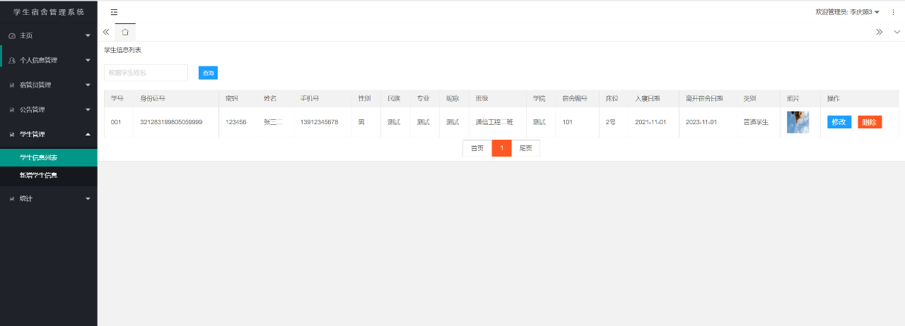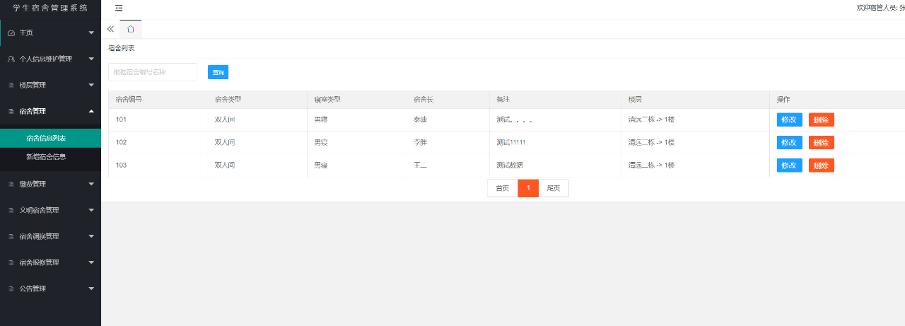 管理员登录后可以对个人信息进行管理、宿管人员信息、学生信息、公告信息进行管理、以及统计功能等。