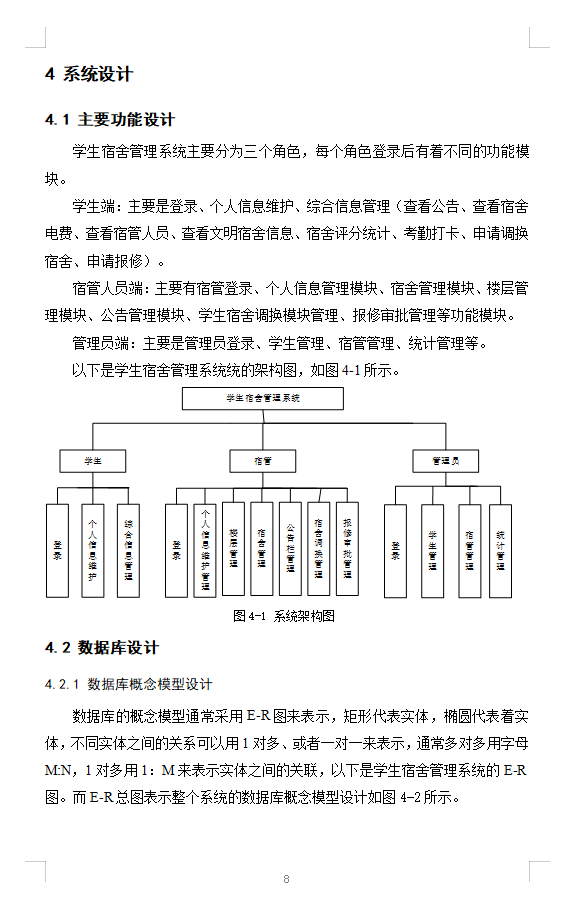学生主要功能模块有登录、个人信息查看修改、查看公告、签到打卡、查看文明宿舍信息、查看宿舍电费、查看宿管人员、申请宿舍调换、报修申请、查看统计信息等。