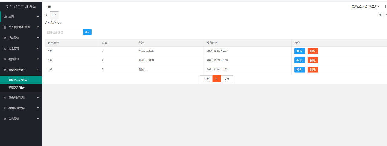 宿管人员登录后,主要的功能模块有个人信息管理、楼层管理、宿舍管理、缴费管理、文明宿舍管理、宿舍调换审批、宿舍报修审批、查看公告等。