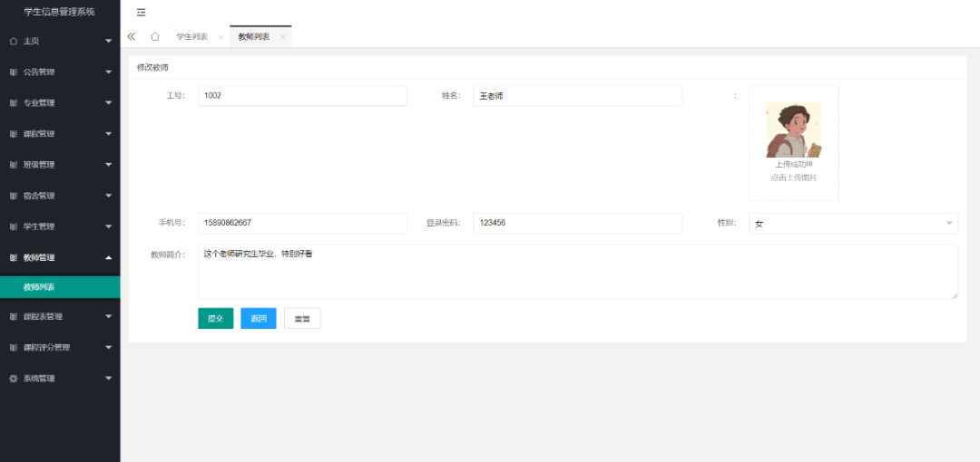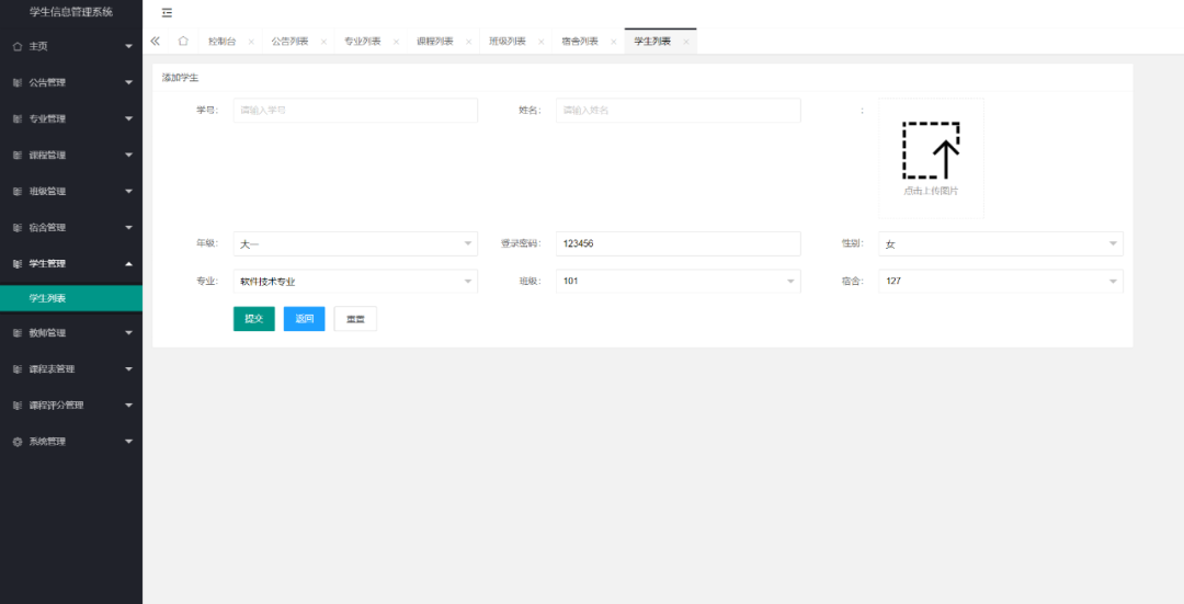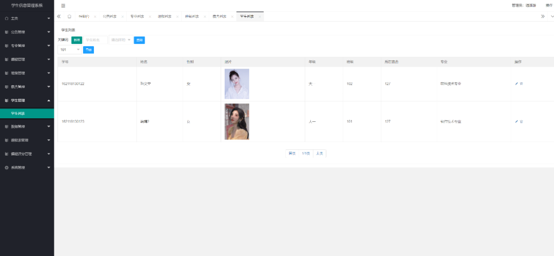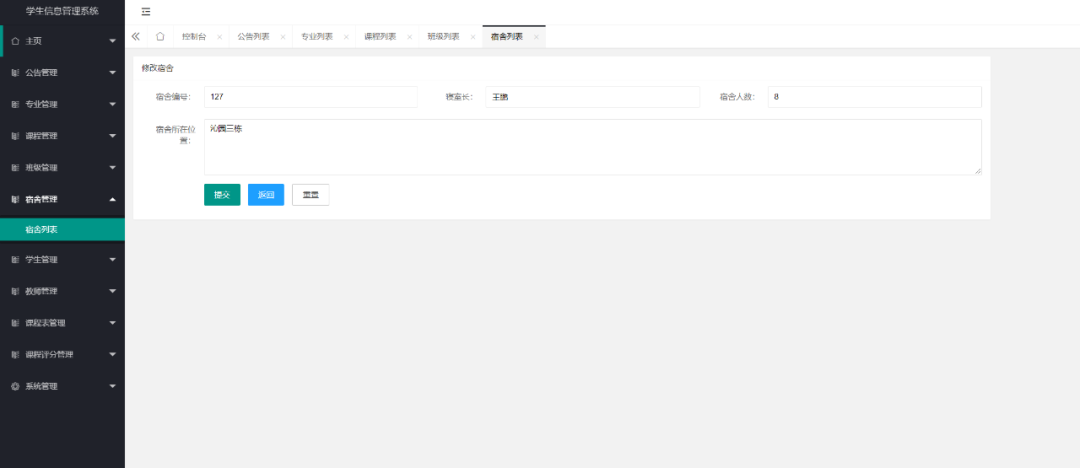 项目简介:本系统分为三个角色,分别是学生、教师、管理员,管理员拥有最高权限可以管理学生、教师、公告、课程评分、专业、班级、课程表、宿舍、课程等功能模块,学生可以查看相关信息,教师负责对课程评分的管理。