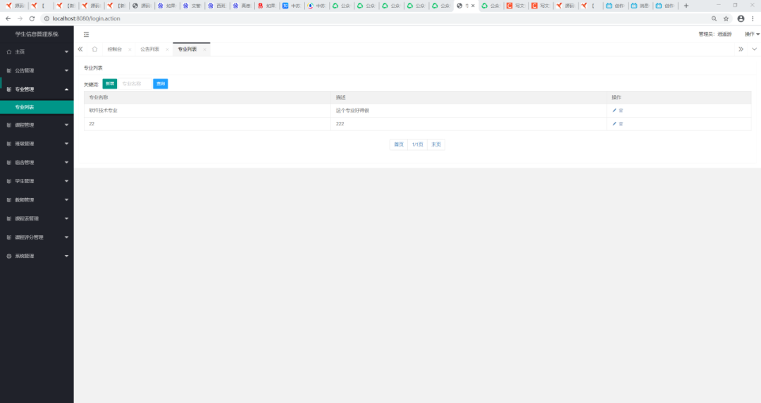 管理员端主要有登录、学生管理、教师管理、公告管理、课程评分管理、专业管理、班级管理、课程表管理、宿舍管理、课程管理、系统管理等功能模块。