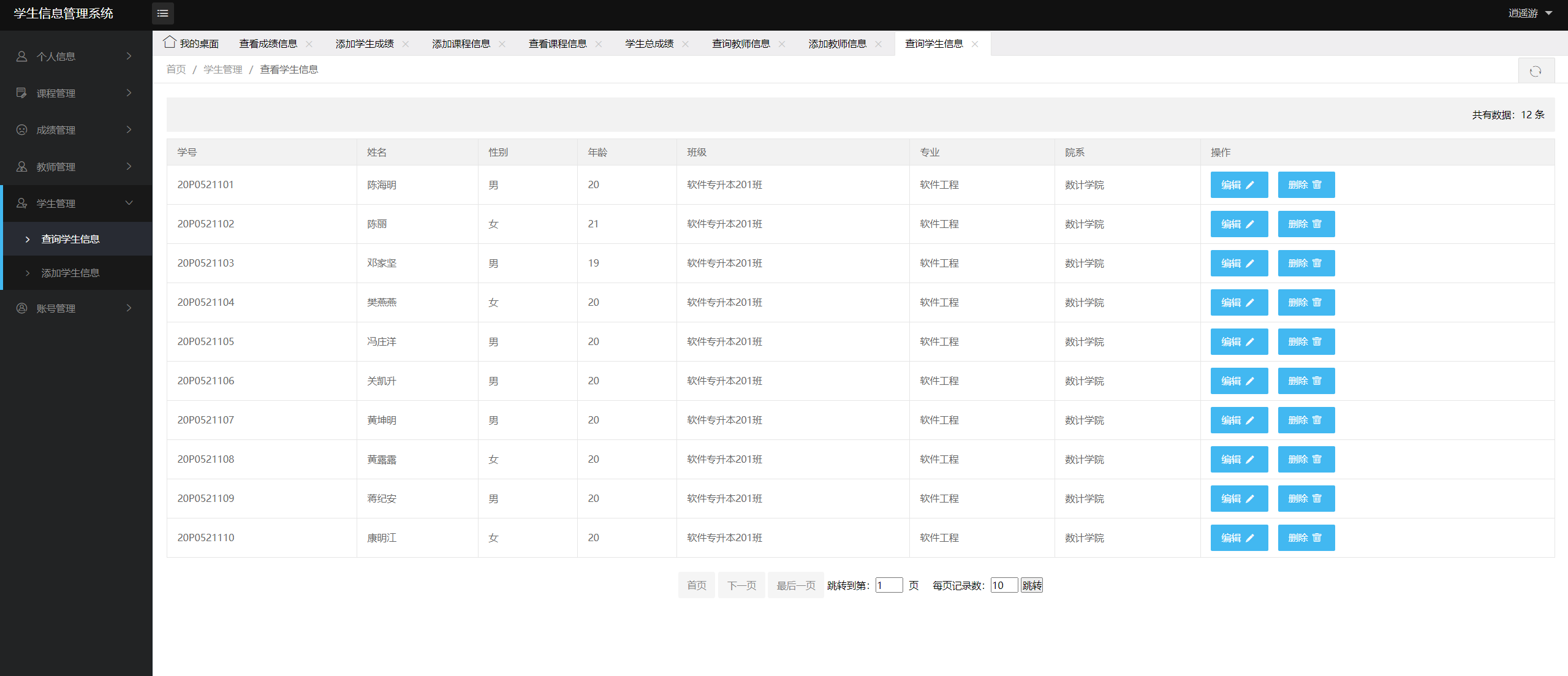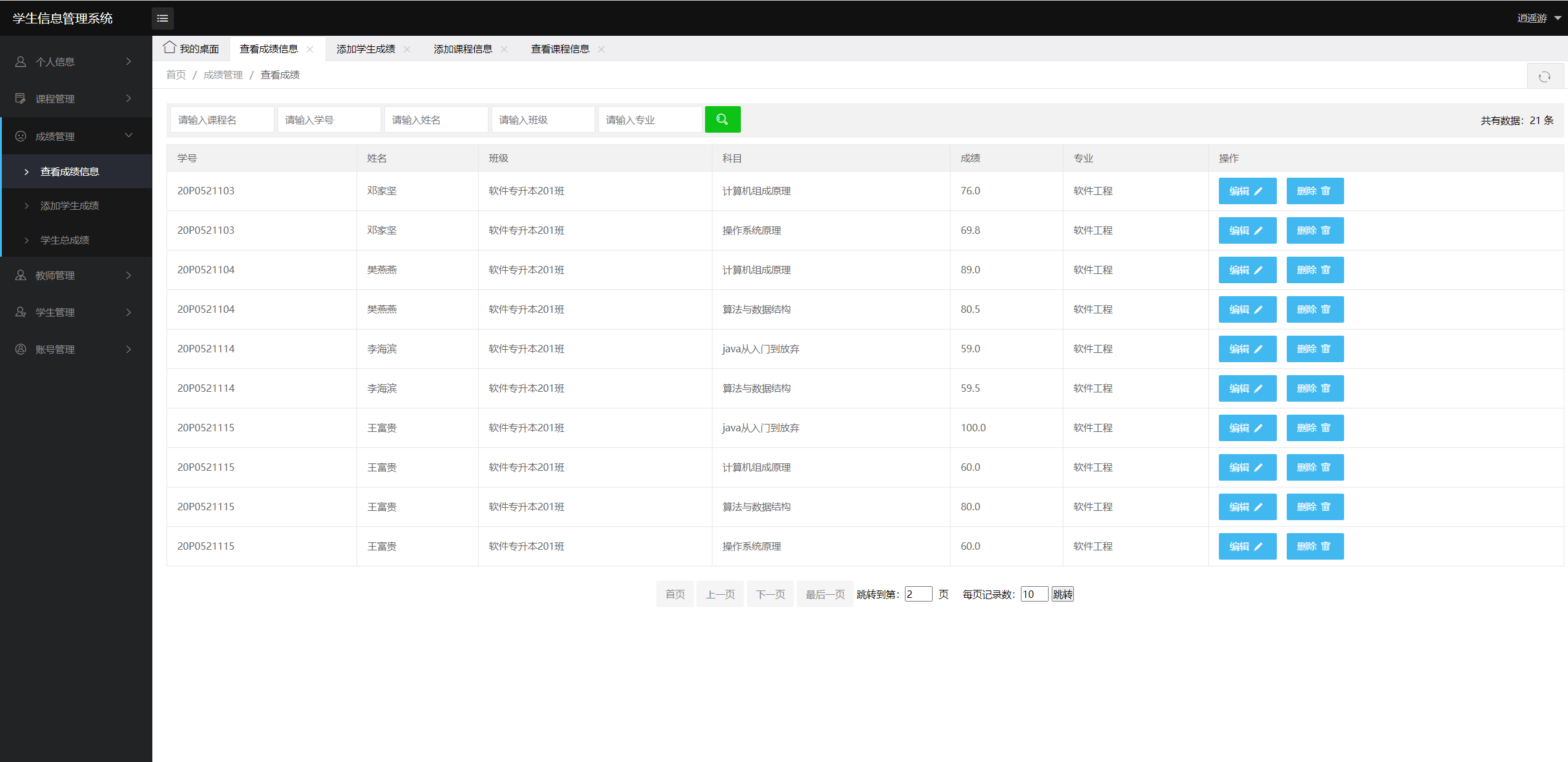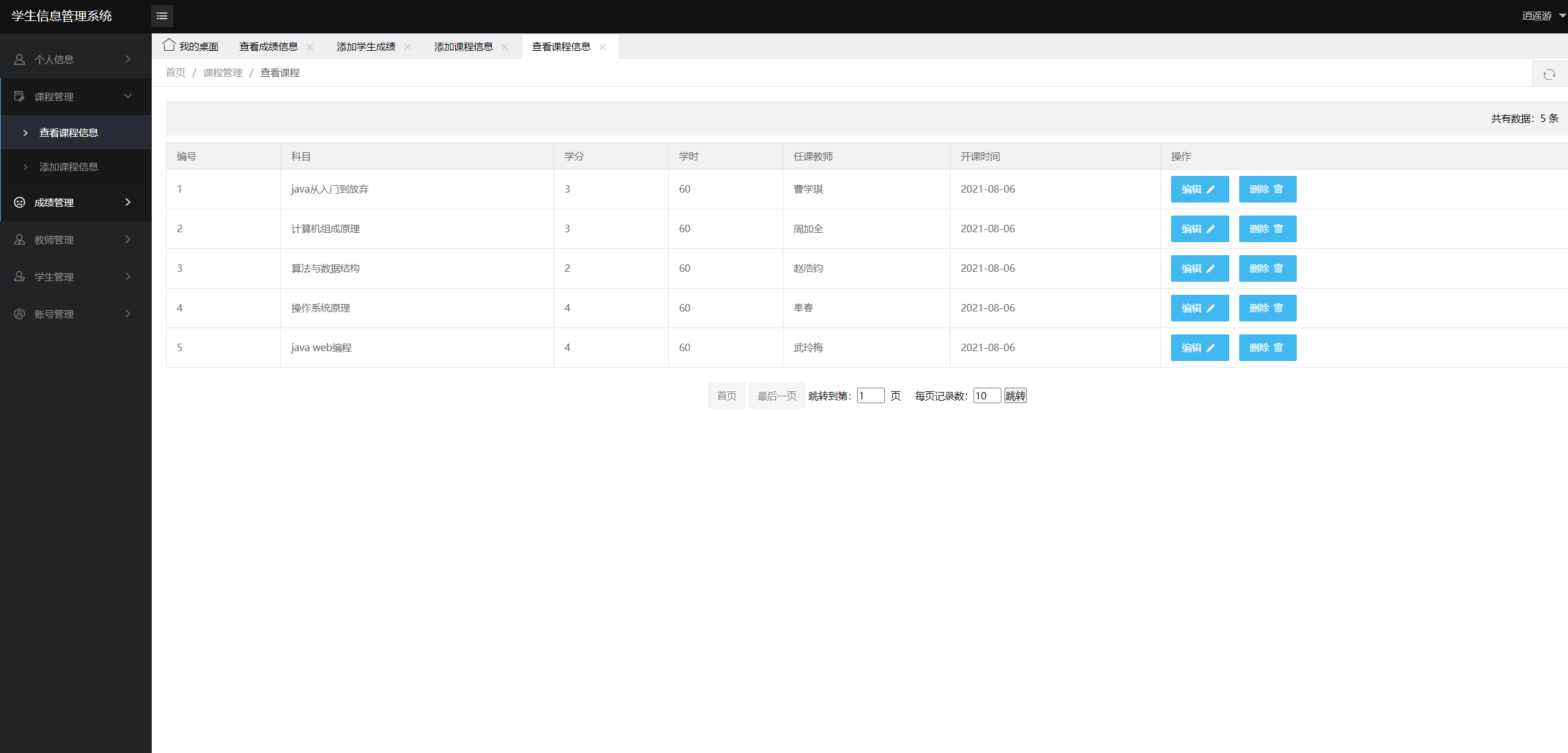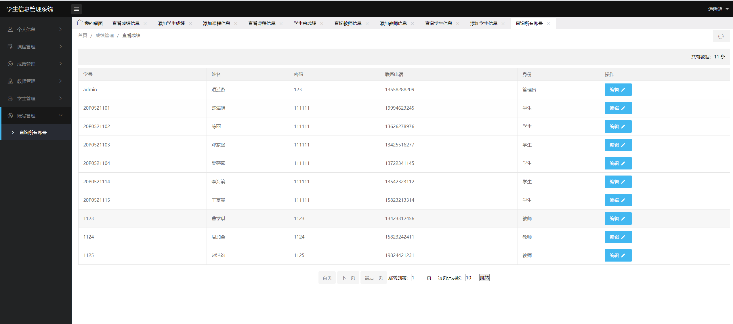 管理员登录后,查看个人信息、学生管理、课程管理、成绩管理、教师管理、账号管理。