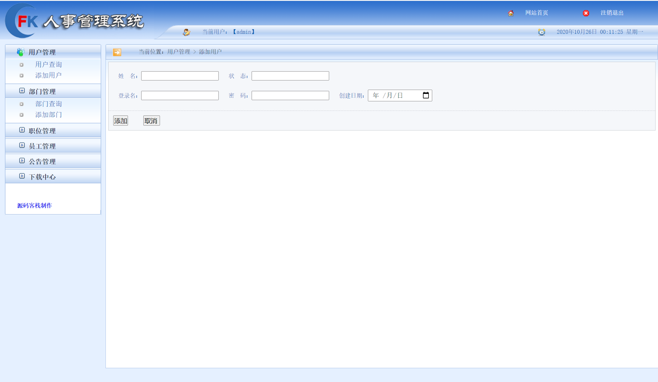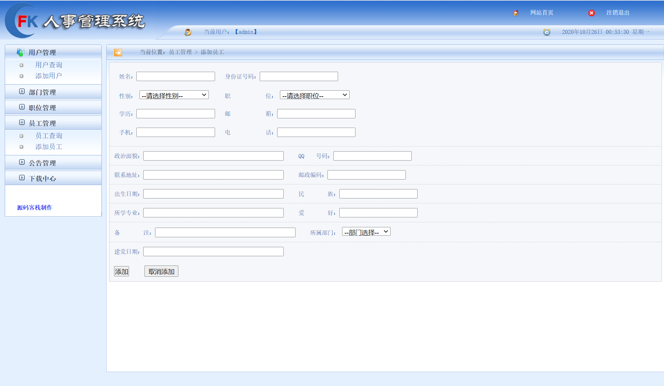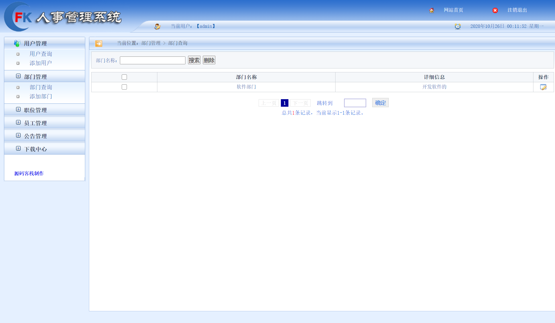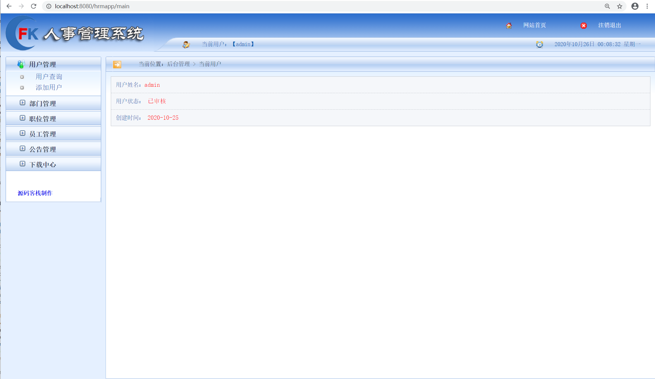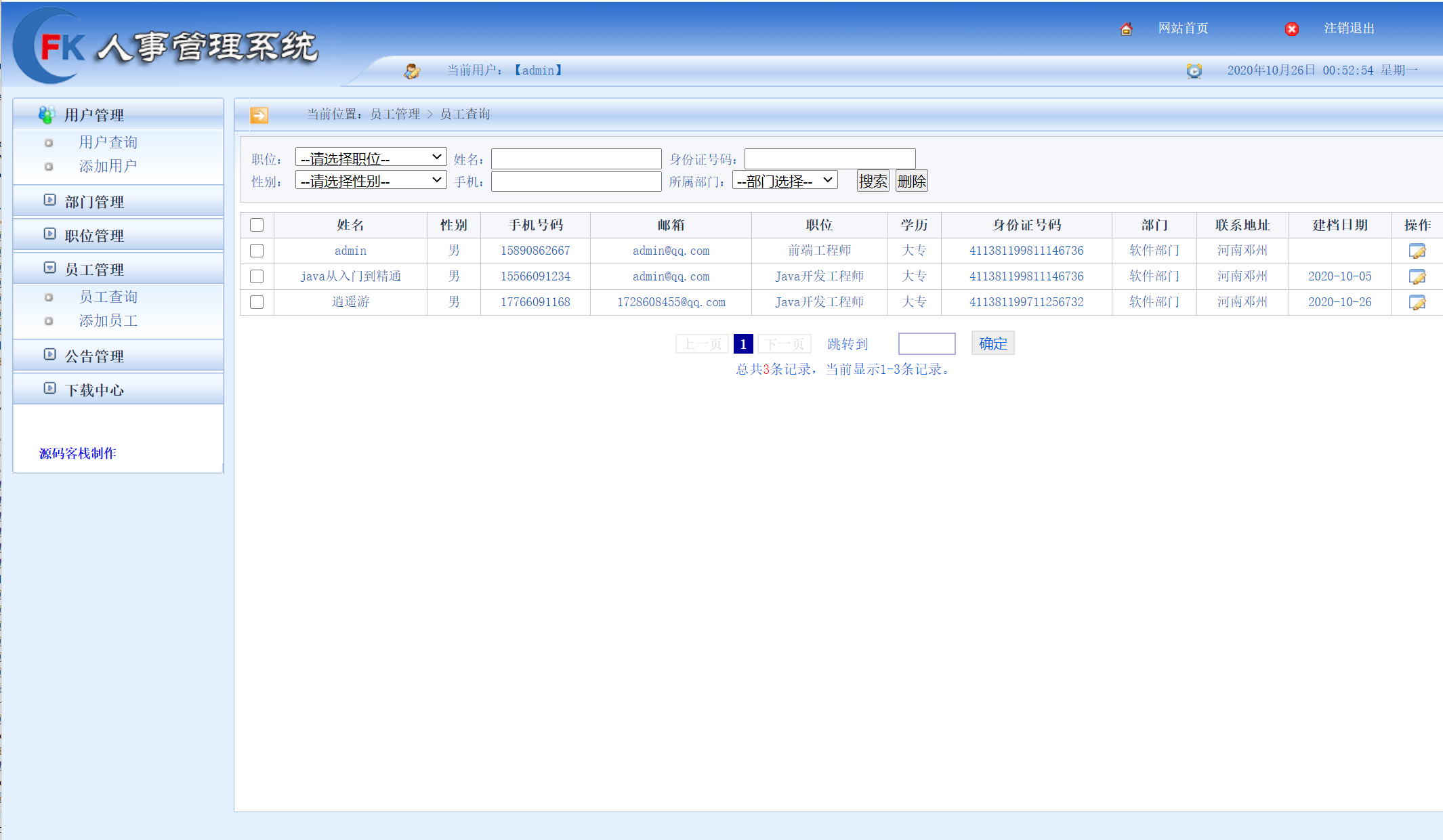 功能描述:本系统员工登录后可以查看员工个人信息,部门信息等,管理员登录以后,具有用户管理、职位管理、部门管理、员工管理、下载中心等模块的增删改查。