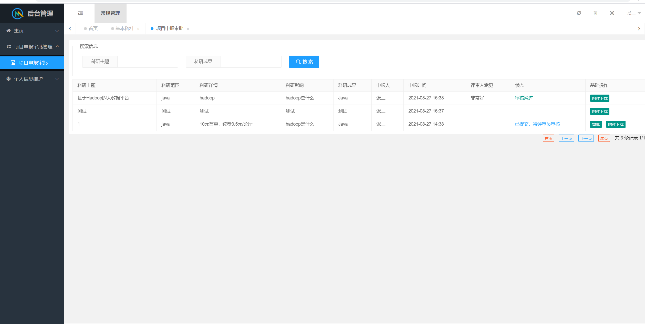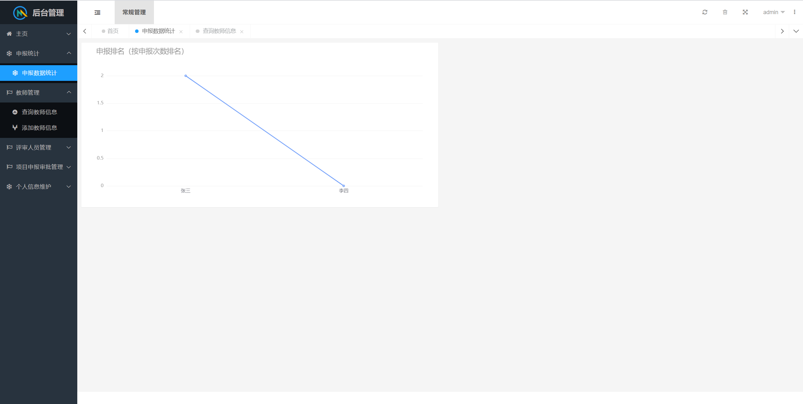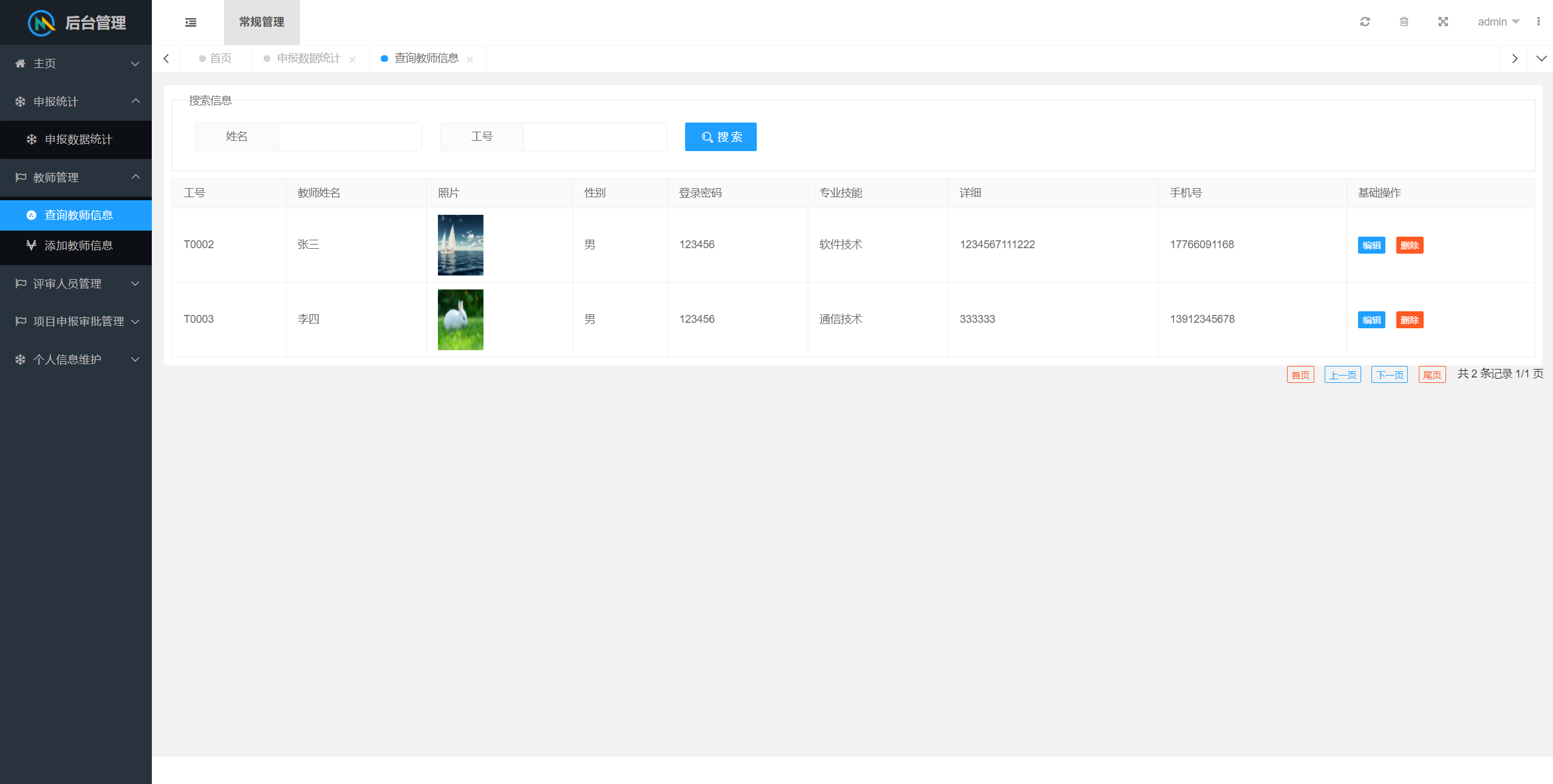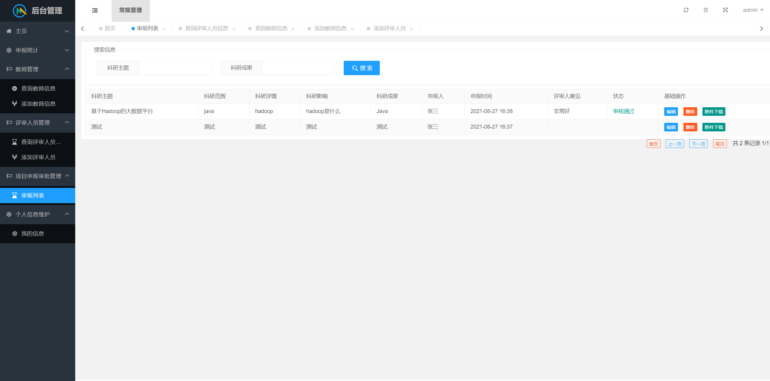 项目简介:本系统主要是教师进行科研项目申报,评审员审批、管理员负责管理项目申报、统计分析、评审员和教师的信息管理。主要功能:教师主要有登录、项目申报列表、我要申报、我的信息等功能。评审员主要有登录、项目审批、个人信息维护等功能。管理员端有登录、申报统计、教师管理、评审人员管理、项目申报审批管理、系统管理等功能。