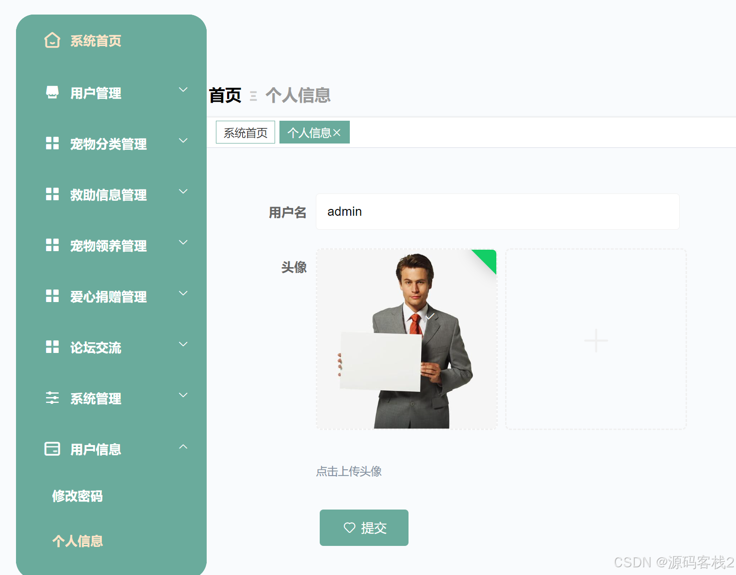 项目简介:基于SpringBoot 的动物救助中心管理系统是一款关于救助动物中心管理的系统。本系统主要分为前台和后台,前台是用户,用户注册登录后进入个人中心进行个人管理。功能模块有;我的宠物领养、我的爱心捐赠、我的帖子发布、我的收藏、个人信息等。管理员登录后进行系统管理。功能模块有;用户管理、爱心捐赠管理、宠物分类管理、宠物领养管理、发布帖子管理、救助信息管理、公告管理、论坛交流管理、修改密码,以及管理员权限内的增删改查。
