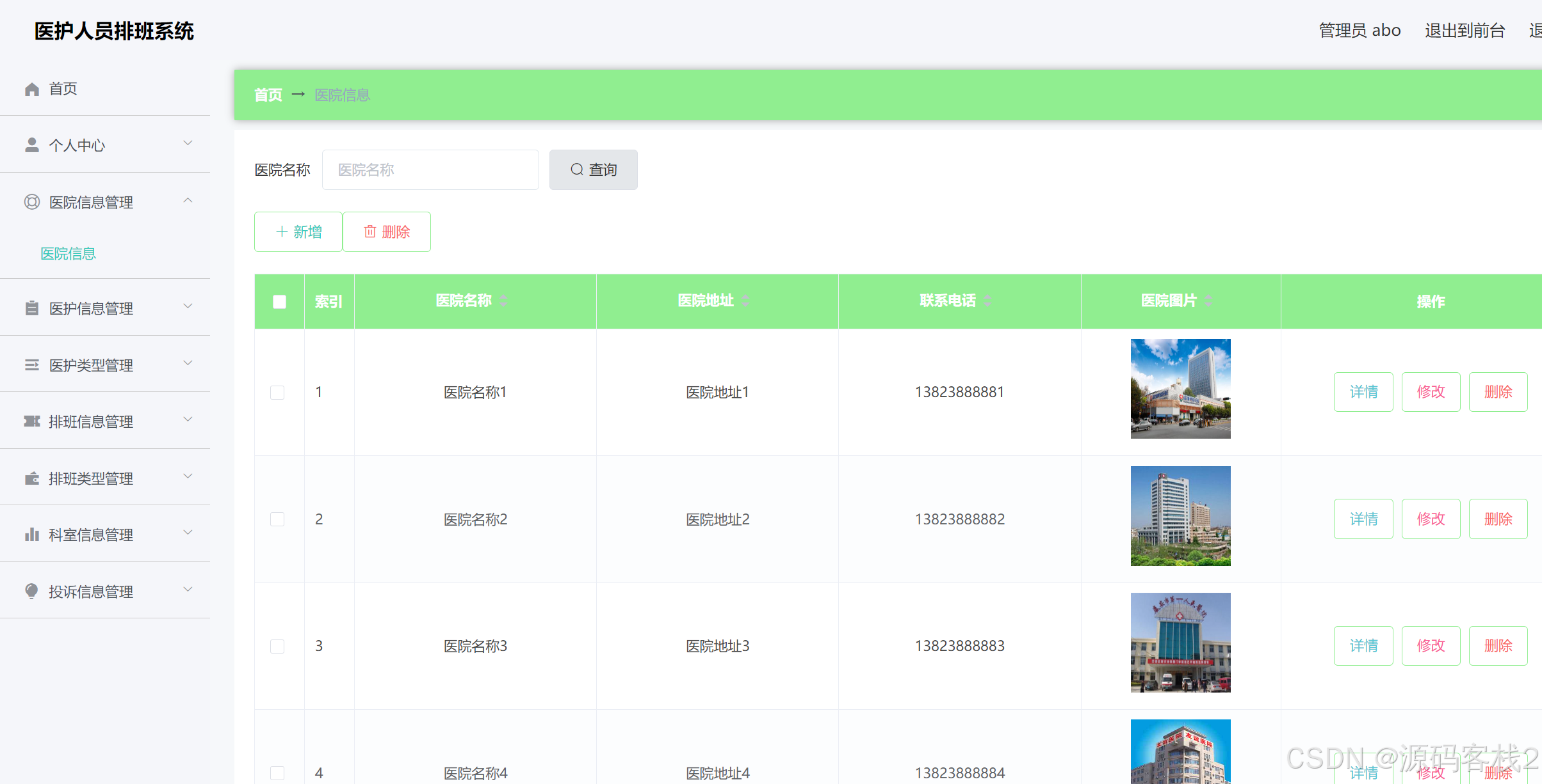 项目简介:基于springboot 的医护人员排班系统,主要分为前台和后台,前台是医护人员,医户人员注册登录后进行个人排班信息管理,主要功能模块有;首页、医院信息、医护信息、科室信息、投诉信息、论坛、我的发布、我的收藏、个人中心、医护个人信息等。后台管理员登录后进行系统管理,主要功能模块有;医院信息管理、医护信息管理、医护类型管理、排班信息管理、排版类型管理、科室信息管理、投诉信息管理、修改密码、以及系统的增删改查。